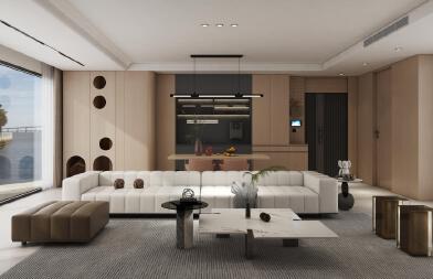 室內(nèi)以暖色為主基,局部深色穿插平衡整個空間,加入黑胡桃與玻璃、金屬多重材質(zhì)碰撞打造出沉靜現(xiàn)代的魅力空間。