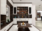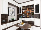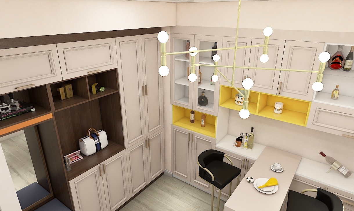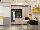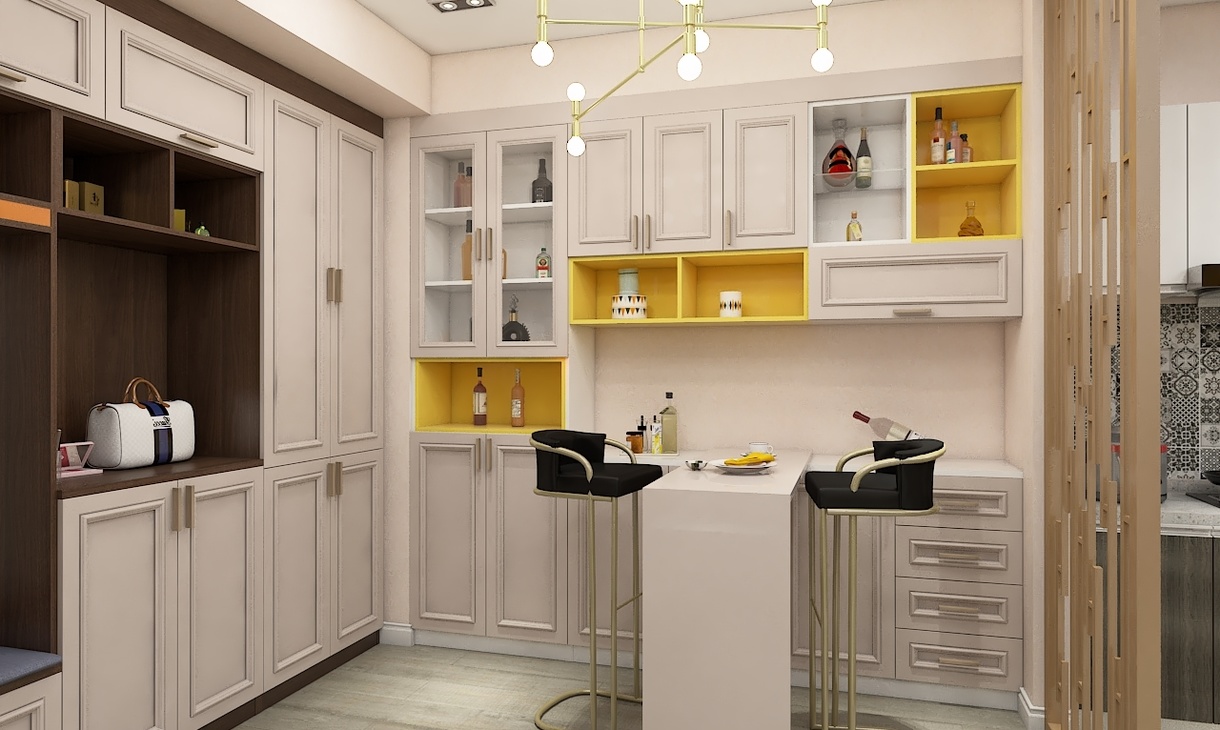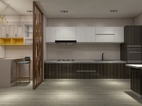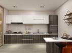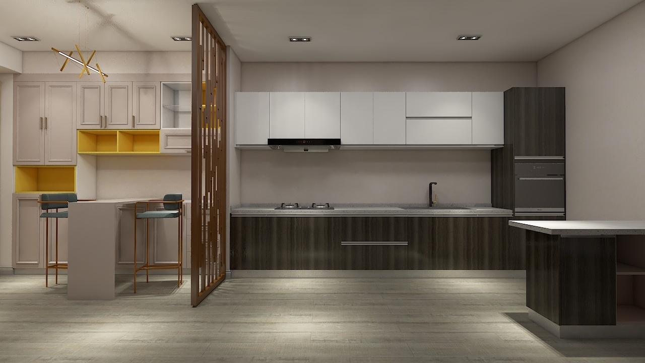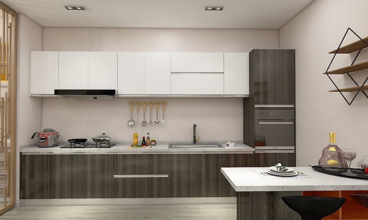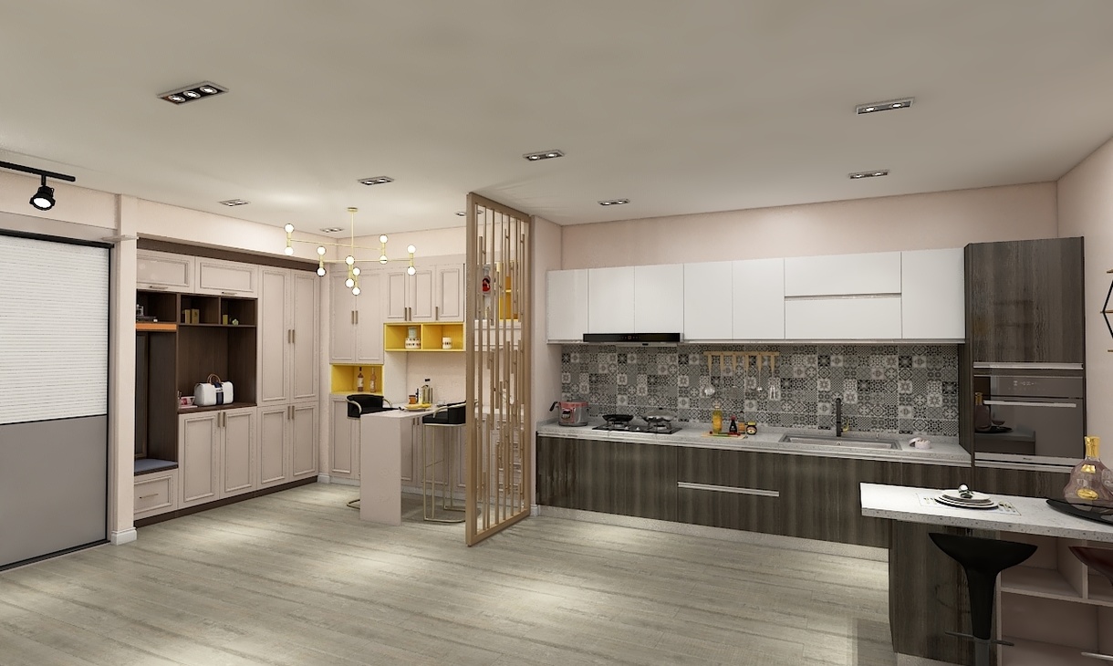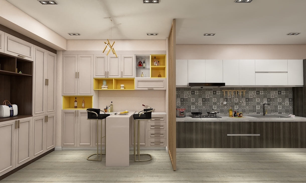 廚房上下柜做撞色搭配,既簡潔又大方的。外面延伸出來的小吧臺,作為休閑區(qū)。