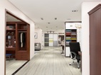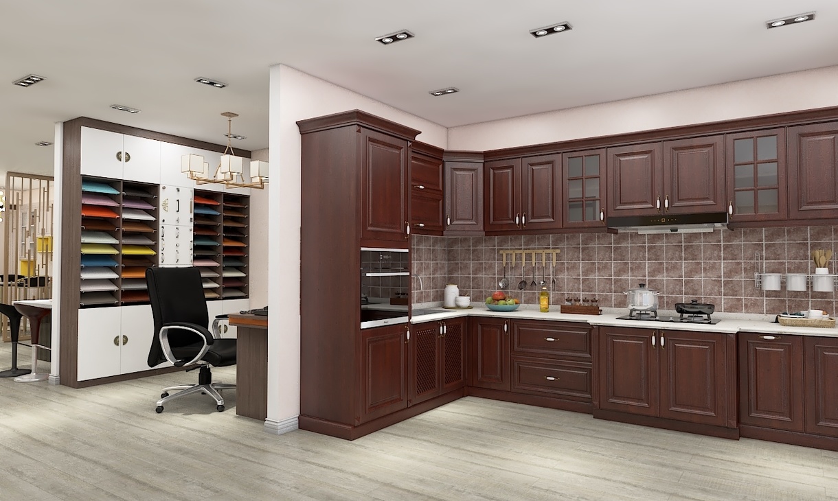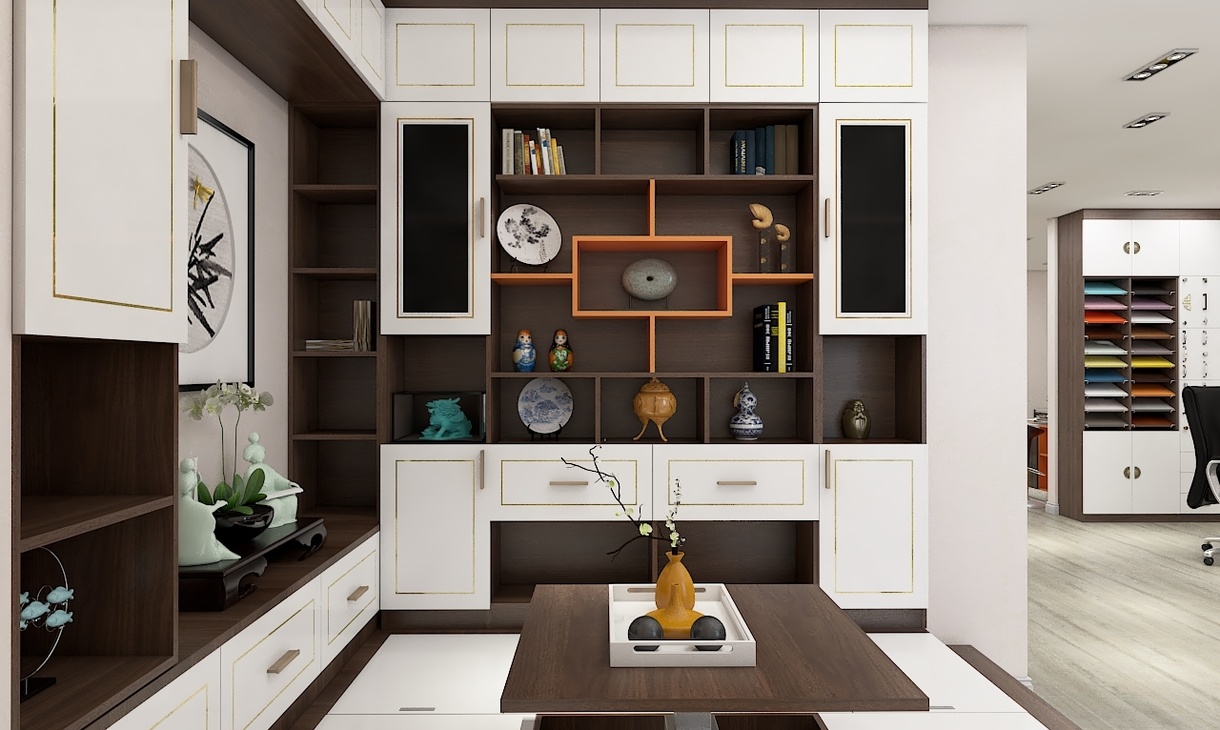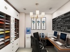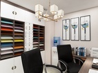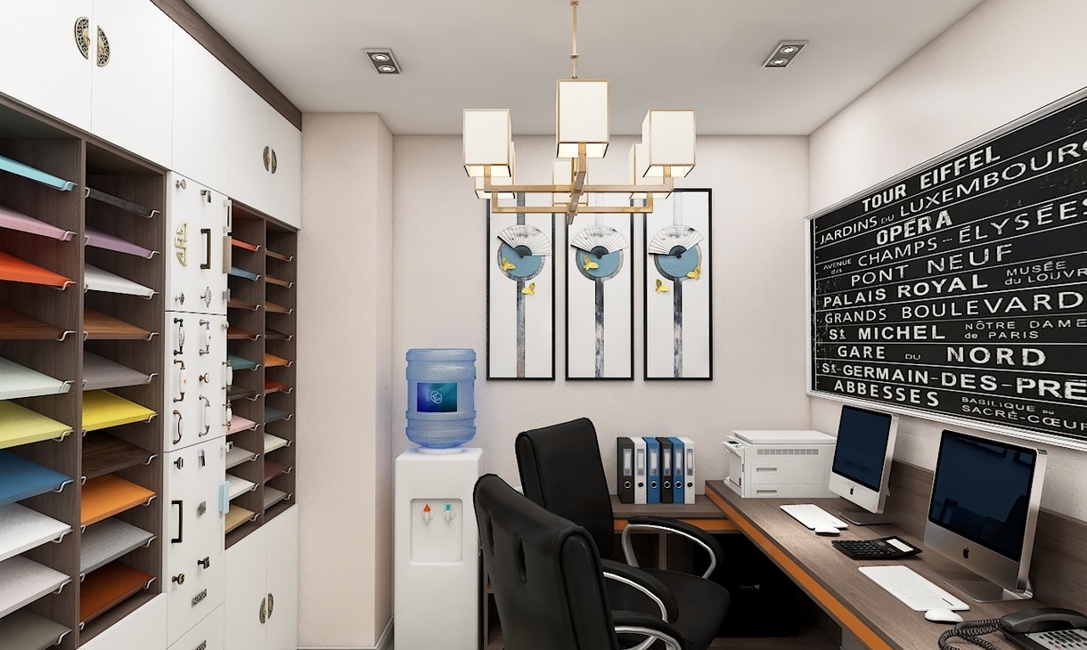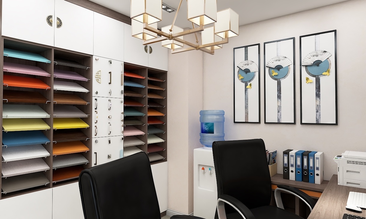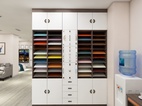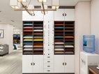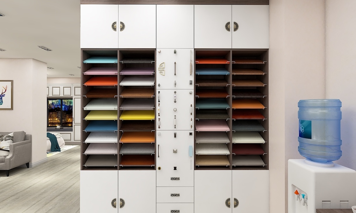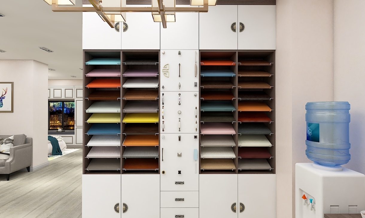 設計工作室現(xiàn)代風格與中式風格的結合,新中式風格更符合當代年輕人的審美觀點。樣塊展架和拉手展示很好的體現(xiàn)出產(chǎn)品的豐富多彩。