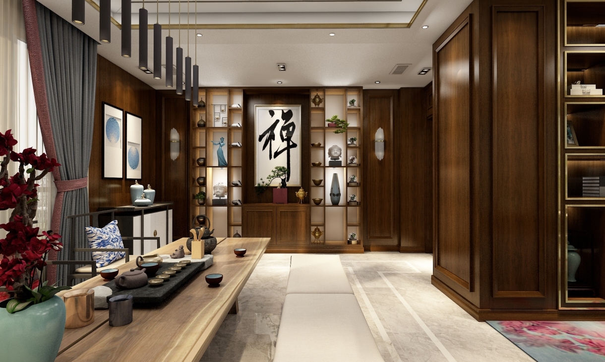 本案為中式茶室,古樸傳統(tǒng)的色彩搭配,配合現(xiàn)代的裝飾元素。古今融合!