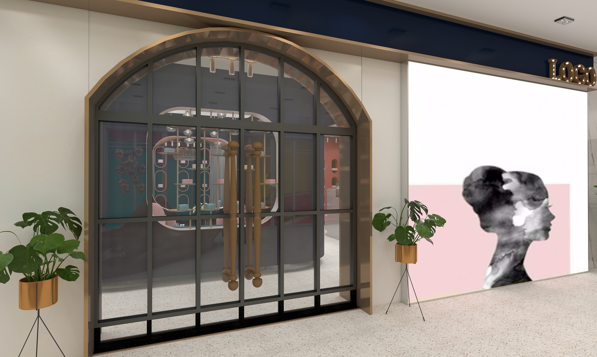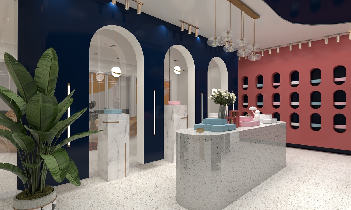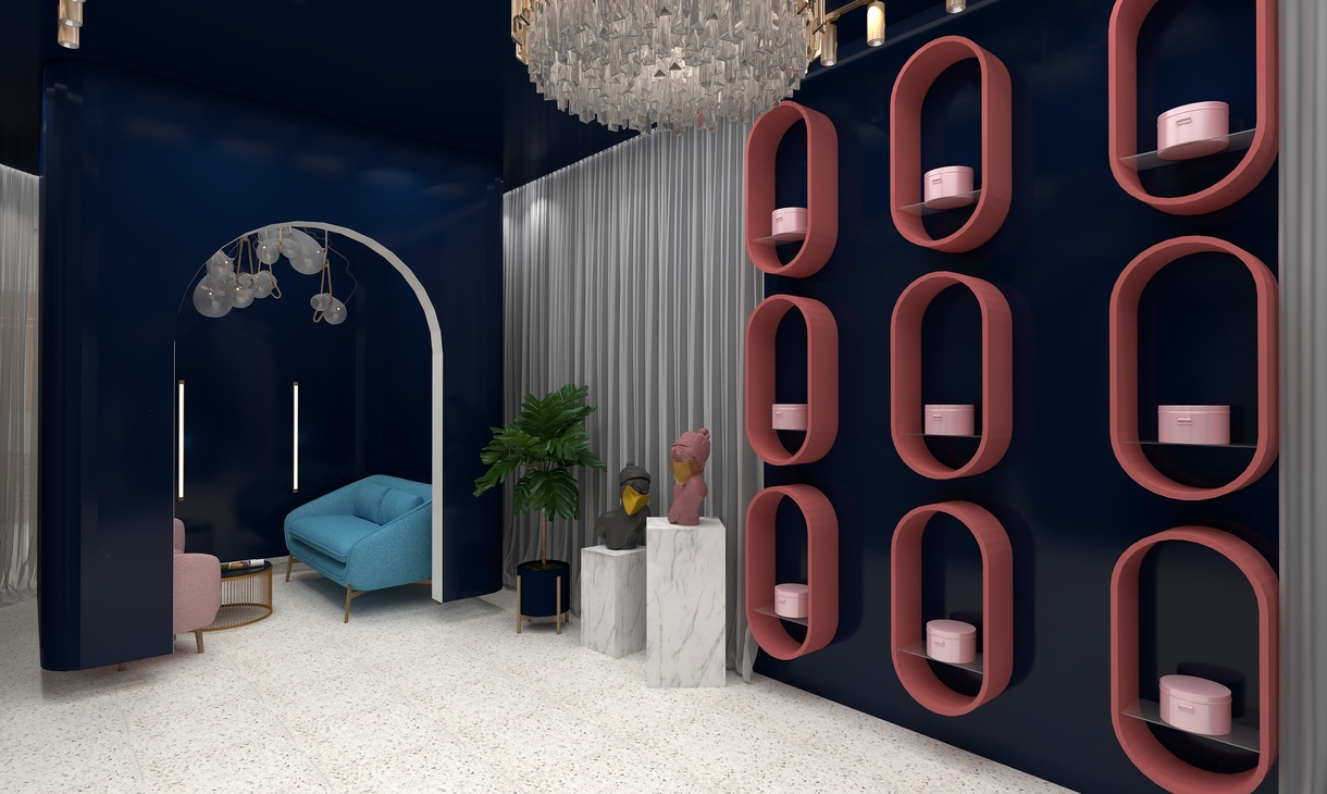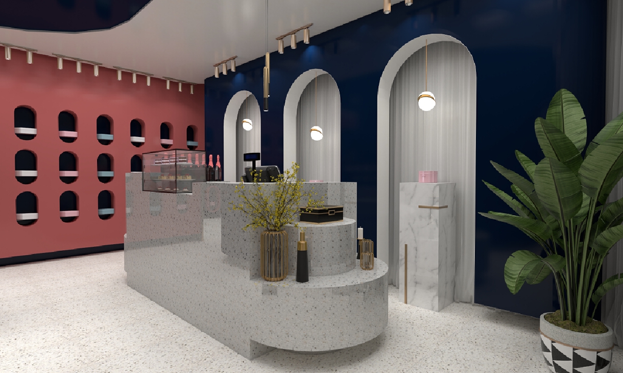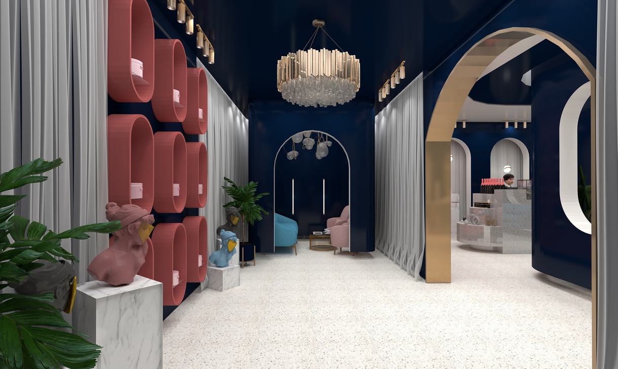 工裝案例,適合服裝店,高端食品店等高端類型店鋪。 設計初衷:以藏青色為底色,搭配粉色的少女風,與土豪金金屬材質(zhì)的碰撞,產(chǎn)生了視覺上的美感。讓人迷戀與向往。兩種顏色的撞擊,像是兩位戀人之間的愛情。完美的融合在一起。整體風格輕奢為主,適合各類型的店鋪。