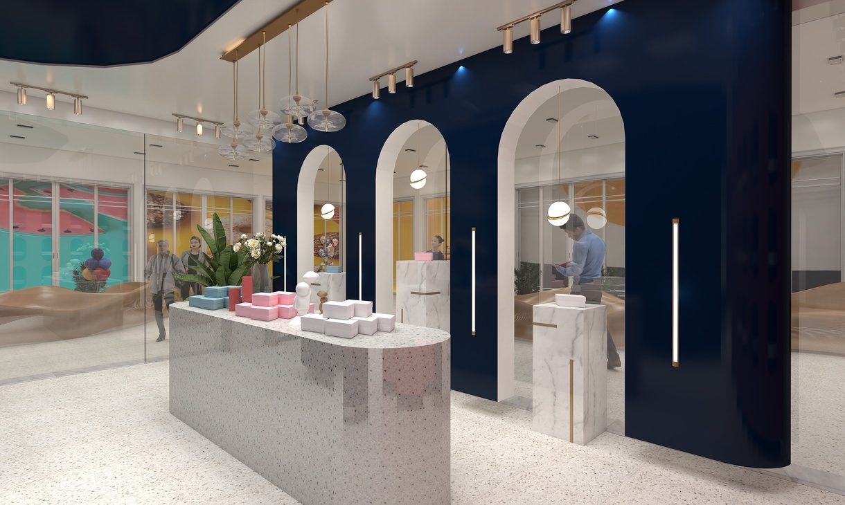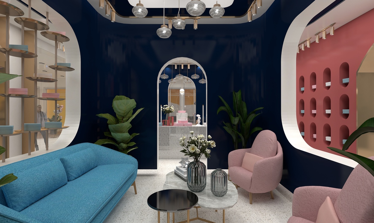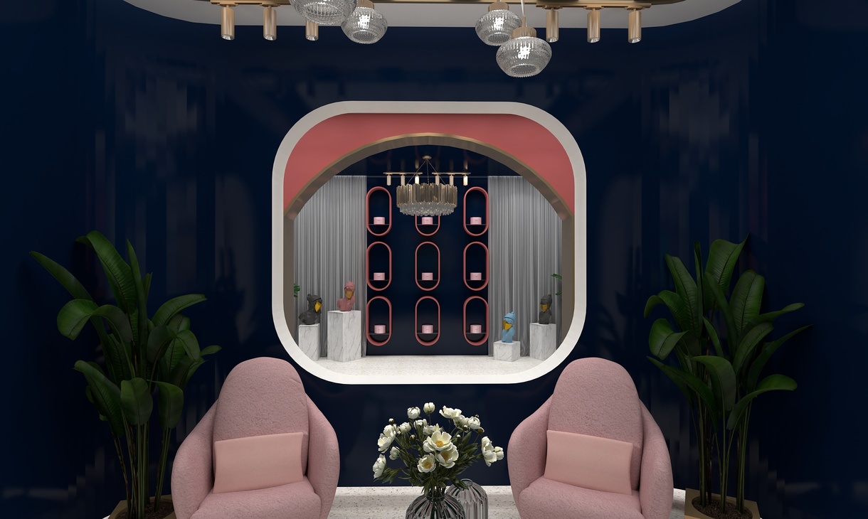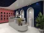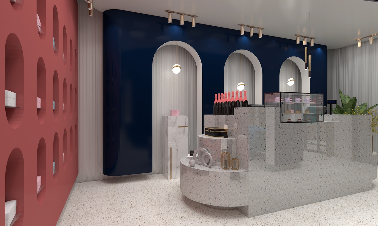工裝案例,適合服裝店,高端食品店等高端類型店鋪。 設計初衷:以藏青色為底色,搭配粉色的少女風,與土豪金金屬材質(zhì)的碰撞,產(chǎn)生了視覺上的美感。讓人迷戀與向往。兩種顏色的撞擊,像是兩位戀人之間的愛情。完美的融合在一起。整體風格輕奢為主,適合各類型的店鋪。