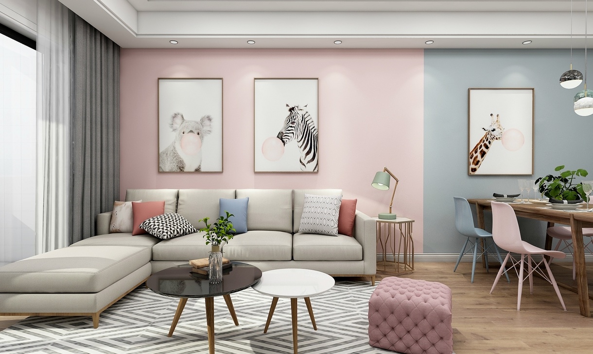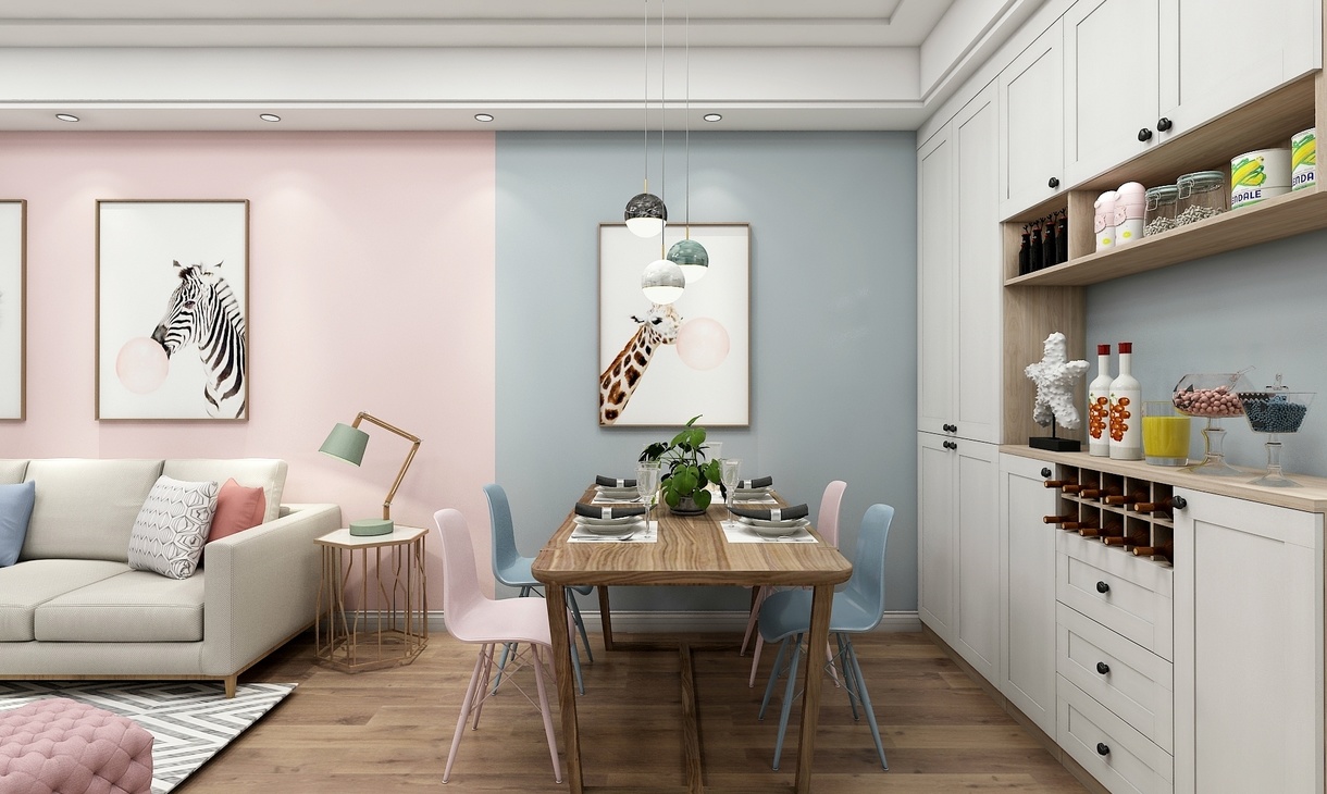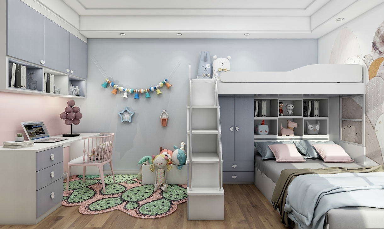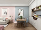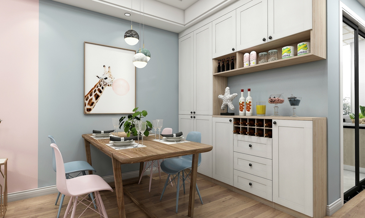 粉色和藍(lán)色的撞色,原木家具和軟裝的搭配,讓整個(gè)空間更加溫馨。