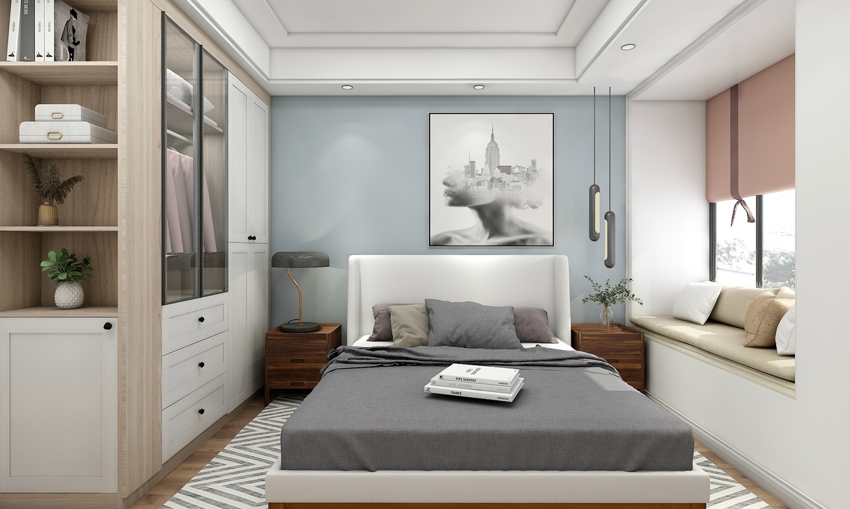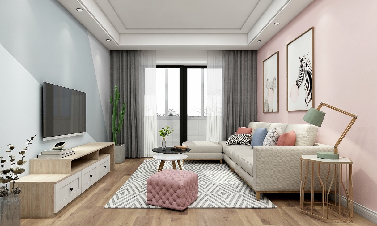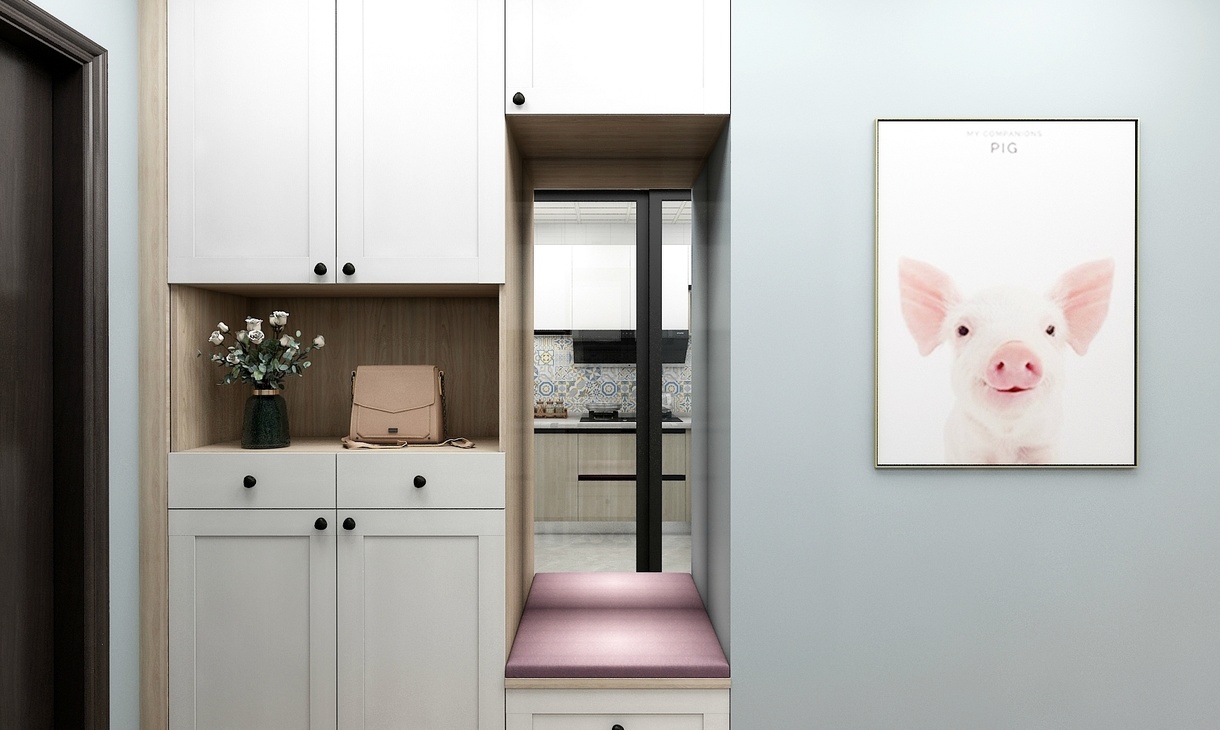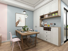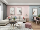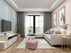 粉色和藍(lán)色的撞色,原木家具和軟裝的搭配,讓整個(gè)空間更加溫馨。
