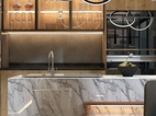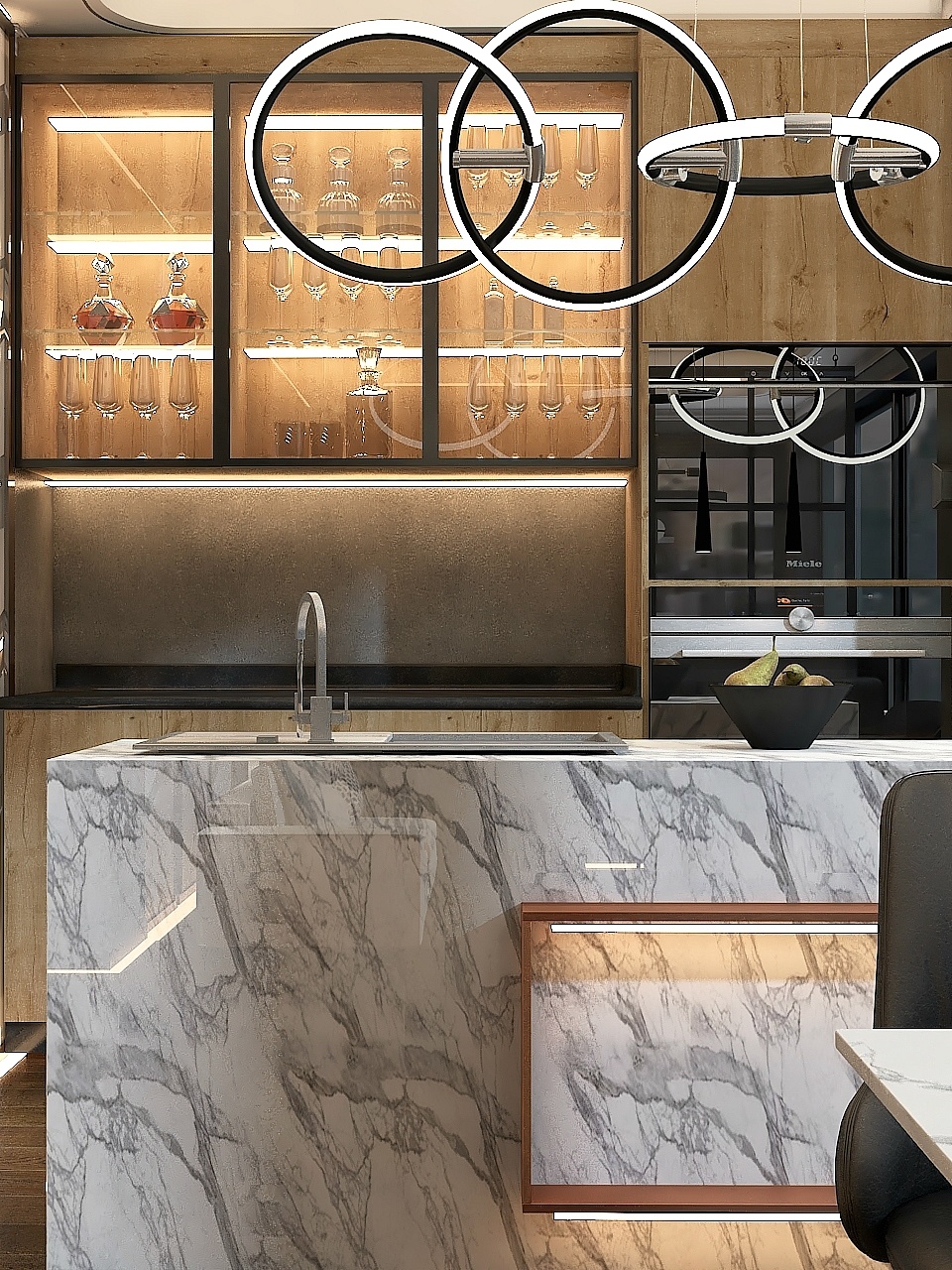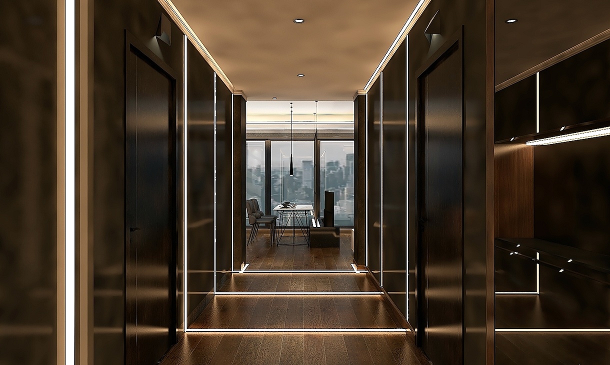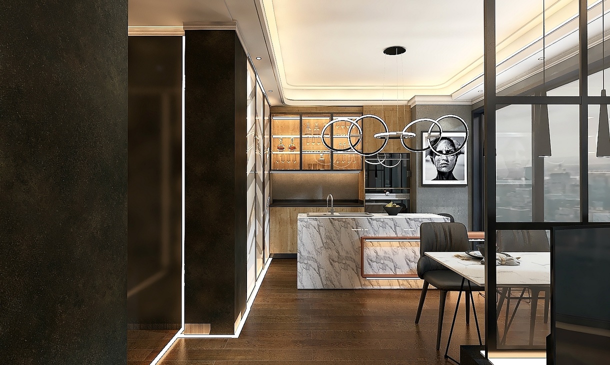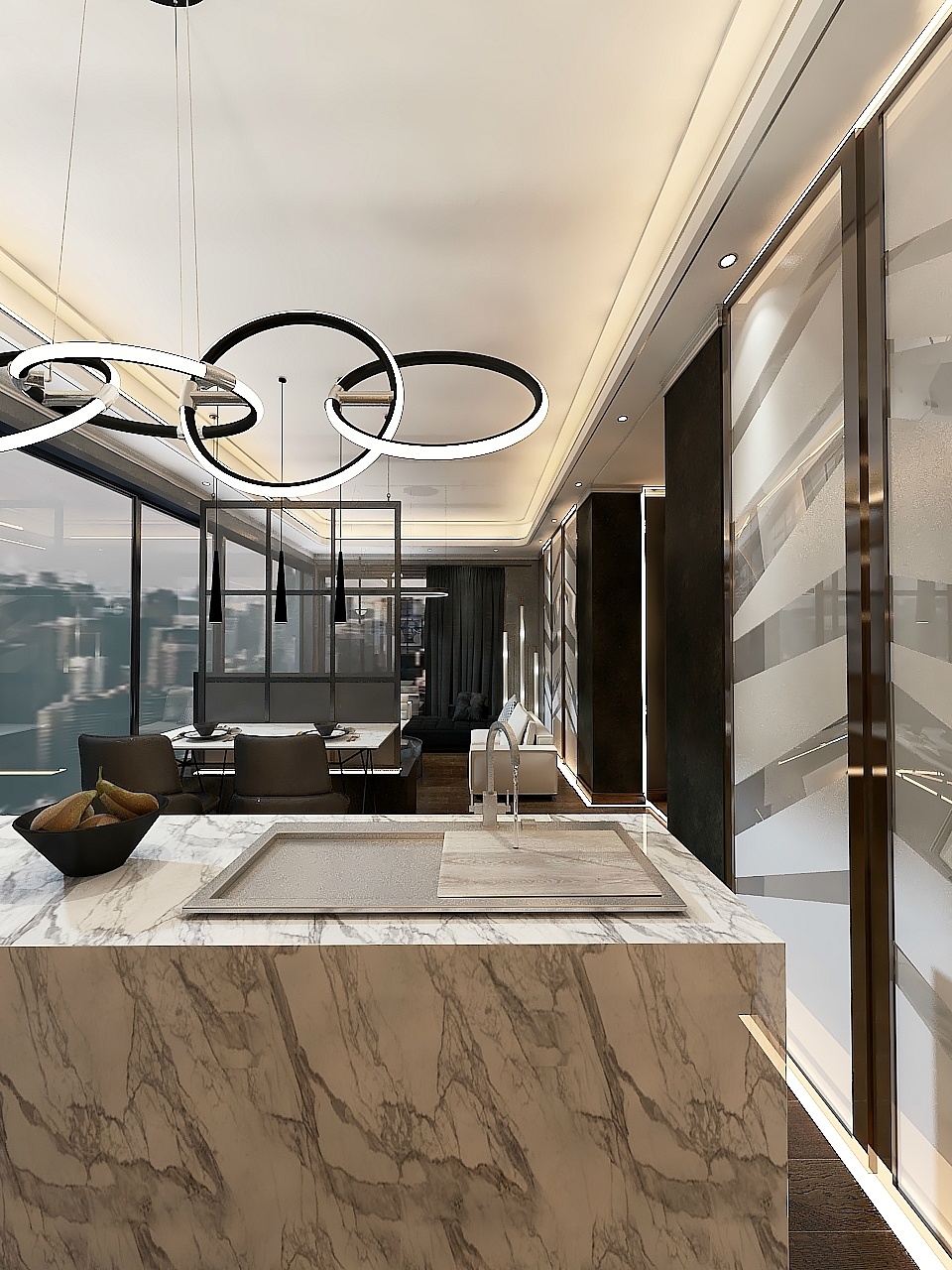 設(shè)計(jì)理念:利用明暗對(duì)比來(lái)呈現(xiàn)空間。暗藏?zé)魩Ч饩€從墻縫內(nèi)照出。形成燈帶群。遠(yuǎn)處看去是海景風(fēng)貌。就像從深處看遠(yuǎn)景的詩(shī)意。