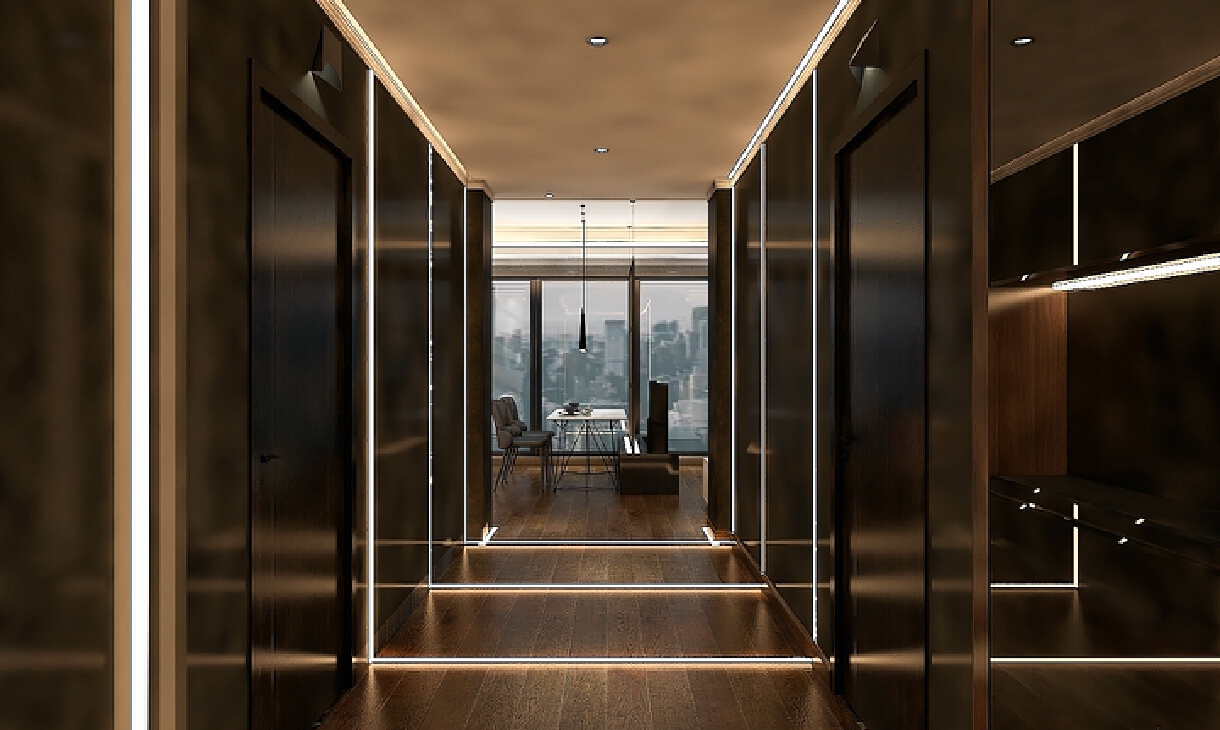 設(shè)計(jì)理念:利用明暗對(duì)比來呈現(xiàn)空間。暗藏?zé)魩Ч饩€從墻縫內(nèi)照出。形成燈帶群。遠(yuǎn)處看去是海景風(fēng)貌。就像從深處看遠(yuǎn)景的詩意。