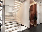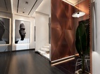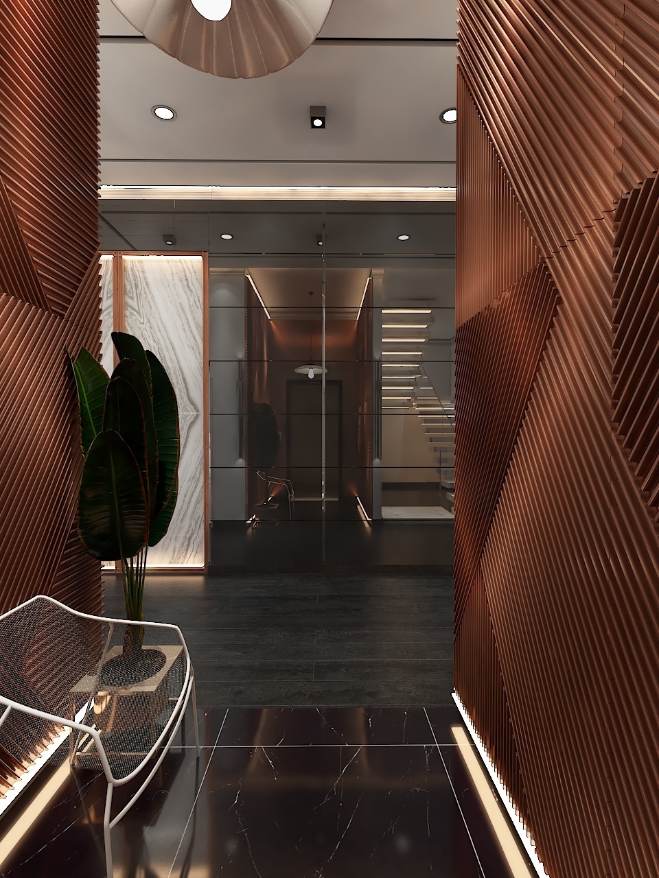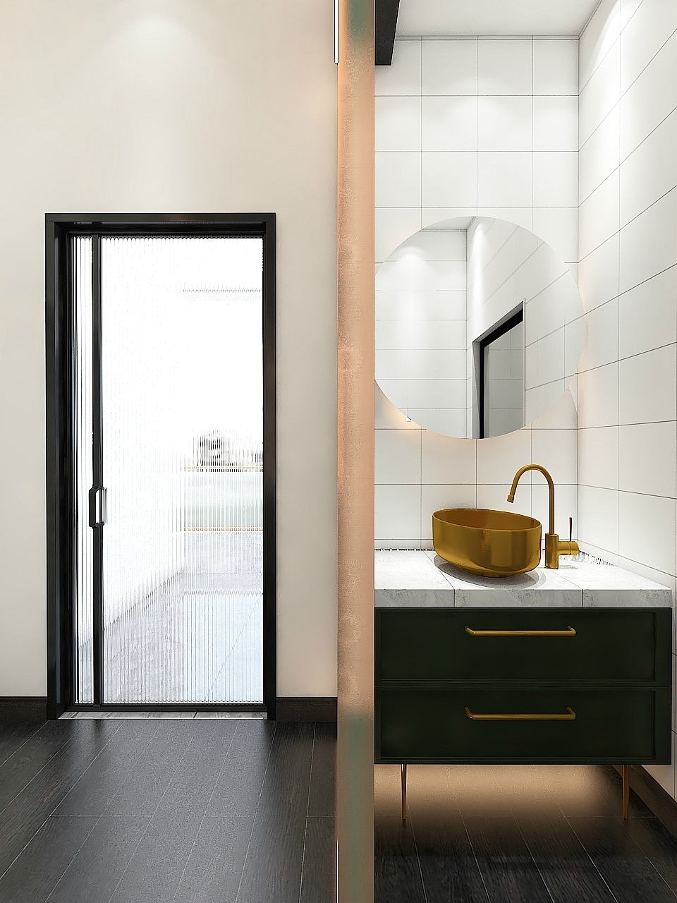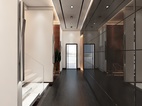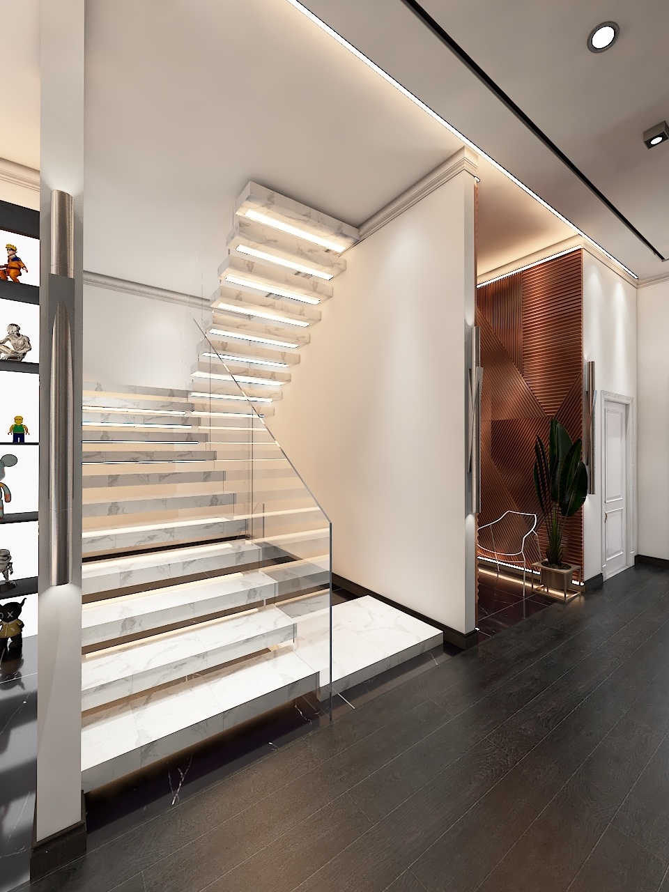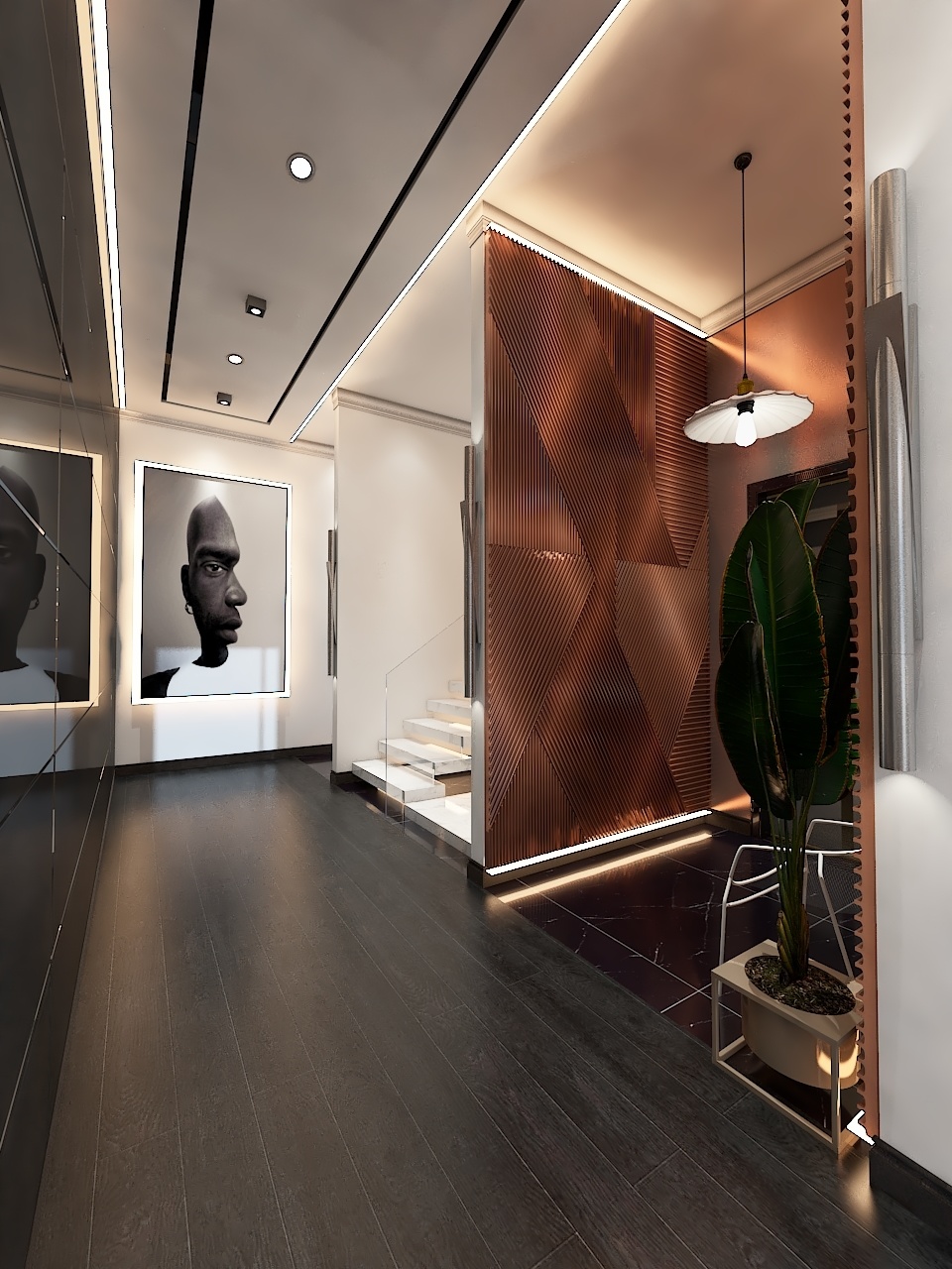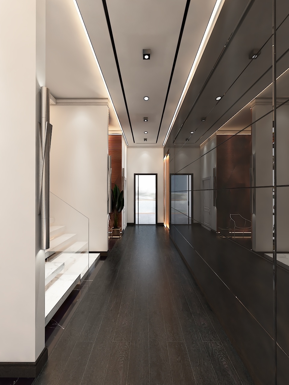 四層走廊地板與負(fù)一層地板一致。采用慕尼黑有木紋肌理的材質(zhì)的地板。白色硅藻泥粗糙肌理墻面搭配黑色慕尼黑實(shí)木地板。一黑一白完美融合在一起。走廊整墻面用的是黑色玻璃。