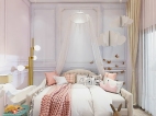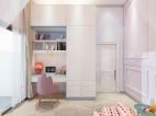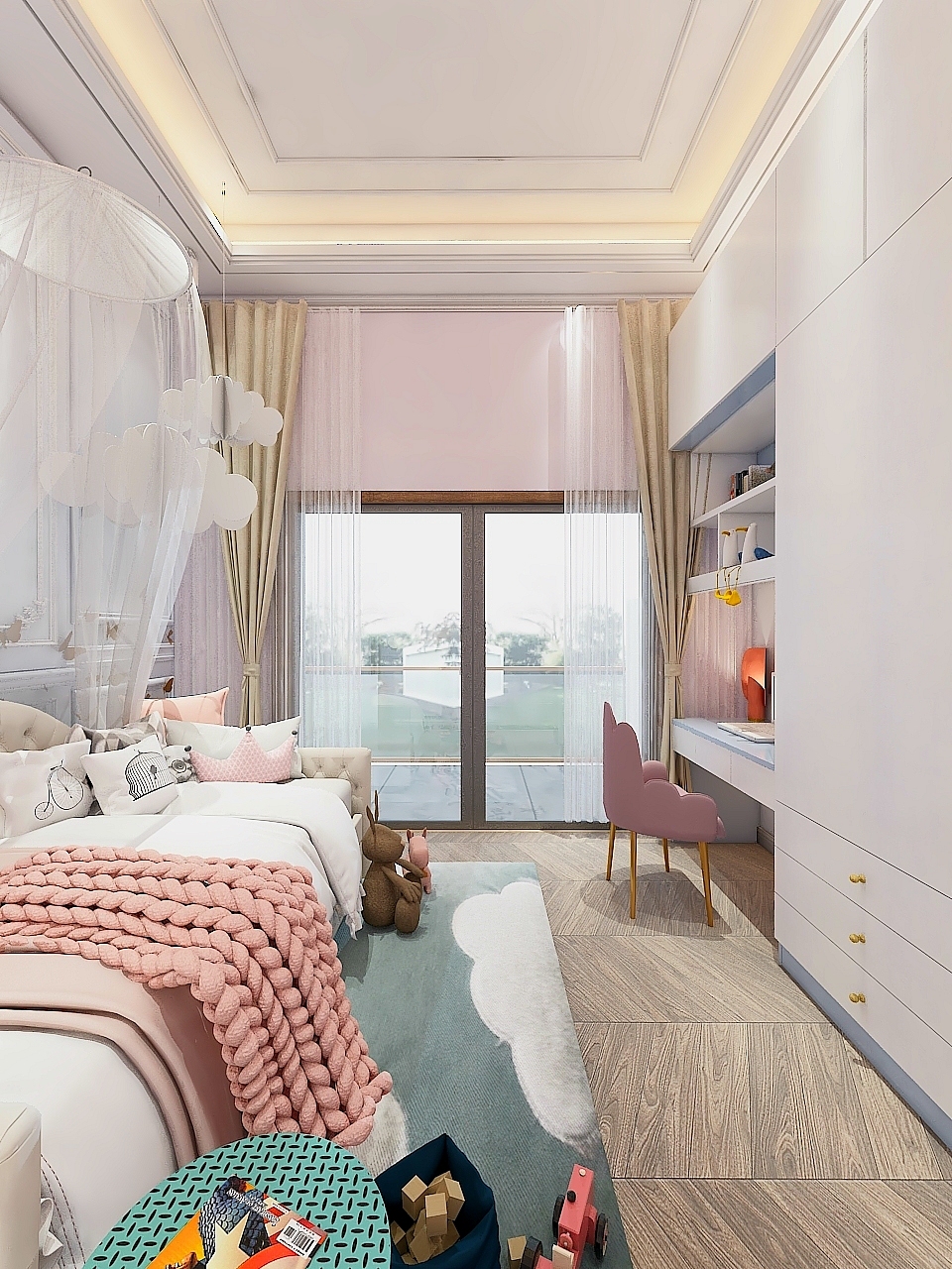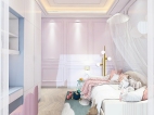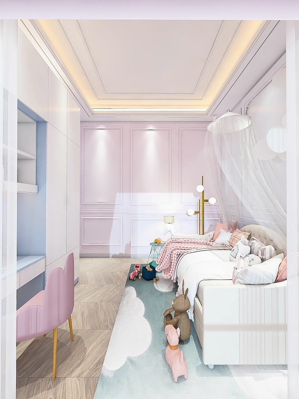 兒童房風(fēng)格偏小歐式風(fēng)格,顏色方面采用粉色、紫色、白色來(lái)搭配空間。墻面運(yùn)用了歐式護(hù)墻板裝飾。更佳凸顯公主房的風(fēng)格。再掛上白色小云來(lái)襯托。