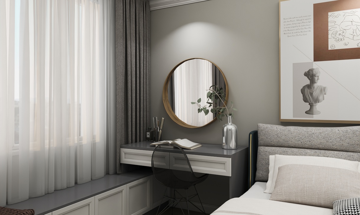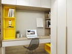 主臥較為溫馨,采用吸塑門板,沿窗做飄窗柜與書柜