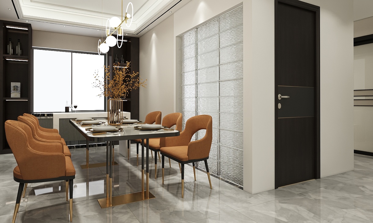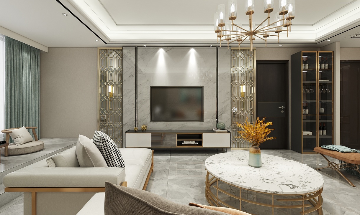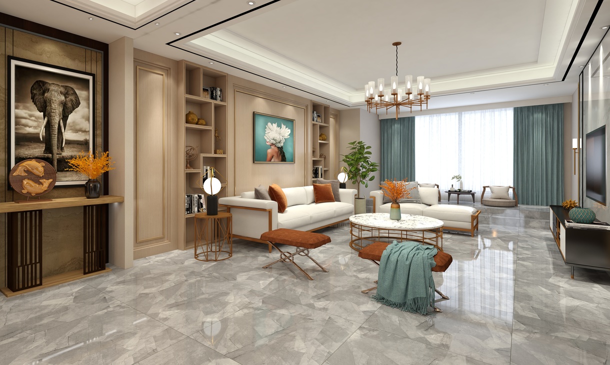 1.輕奢風(fēng)格 2.客餐廳 3.幾何灰 4.東鵬瓷磚