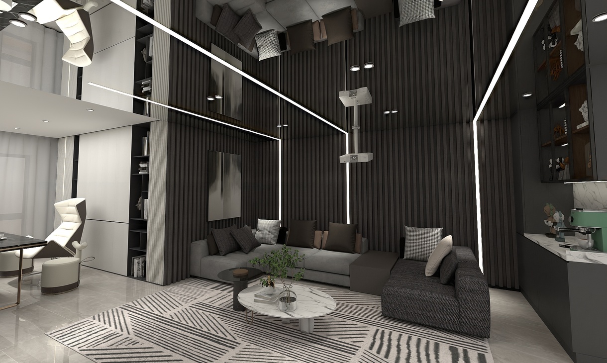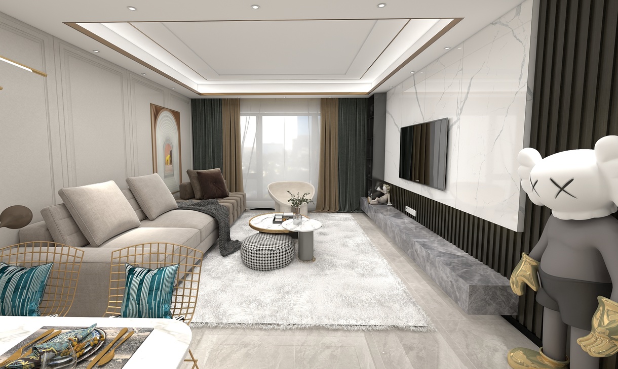 在這套作品中,大膽選擇了當(dāng)下流行的現(xiàn)代主義設(shè)計,開放式的格局客廳空間,書房可供平常休息使用。客廳是接待客人、休閑觀影的重要場所,一盞柔軟舒適的沙發(fā),用純正的線條,完成了優(yōu)雅溫馨的氛圍感。