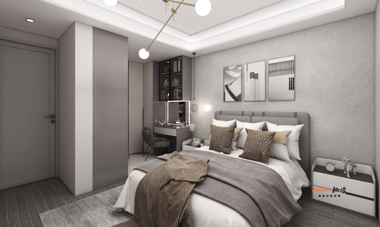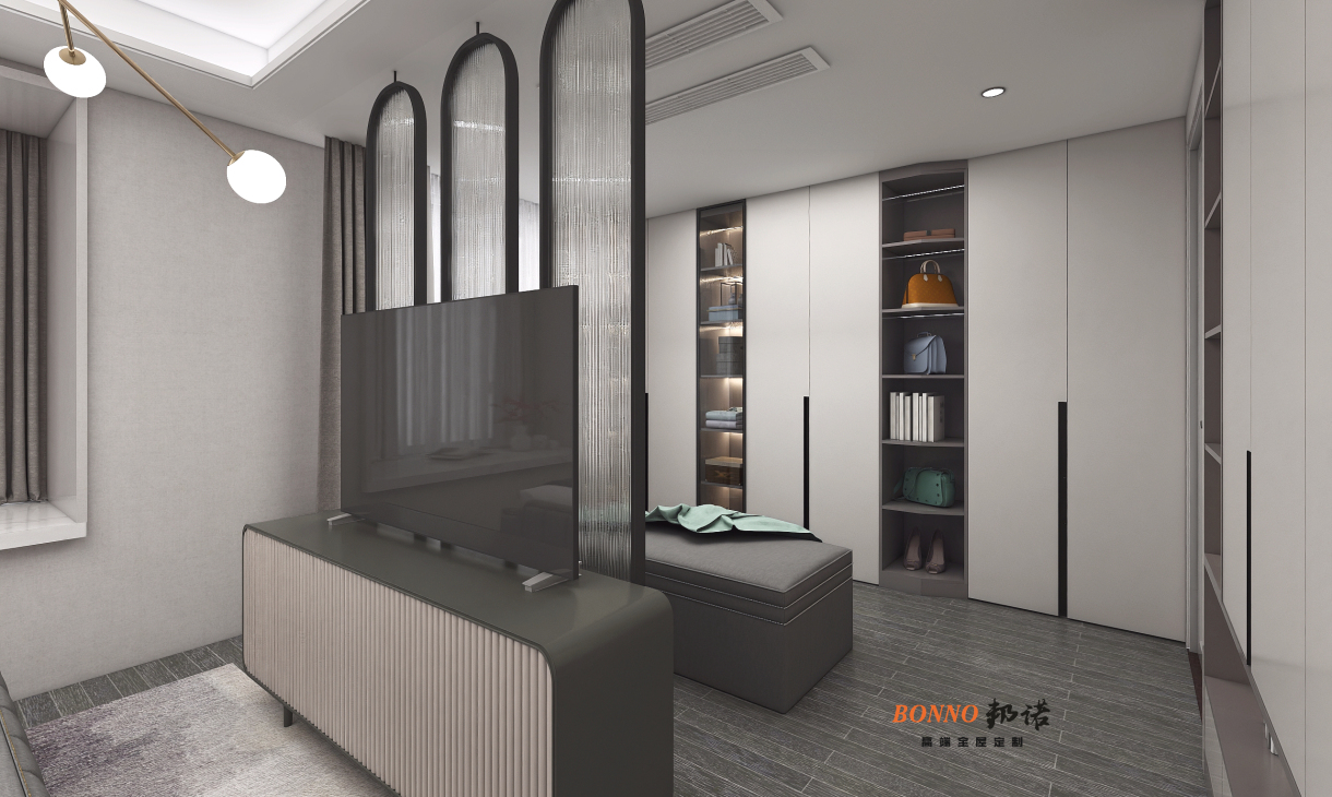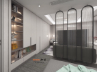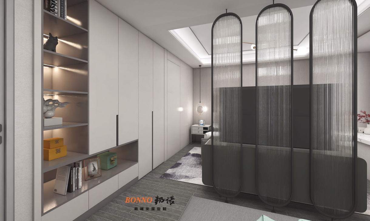 業(yè)主要求舒適空間溫馨,靚麗簡(jiǎn)約,衛(wèi)生間采用隱形門,做護(hù)墻板,整體衣帽柜做部分開(kāi)放格,錯(cuò)落有致,使用便利,是空間不會(huì)沉悶。