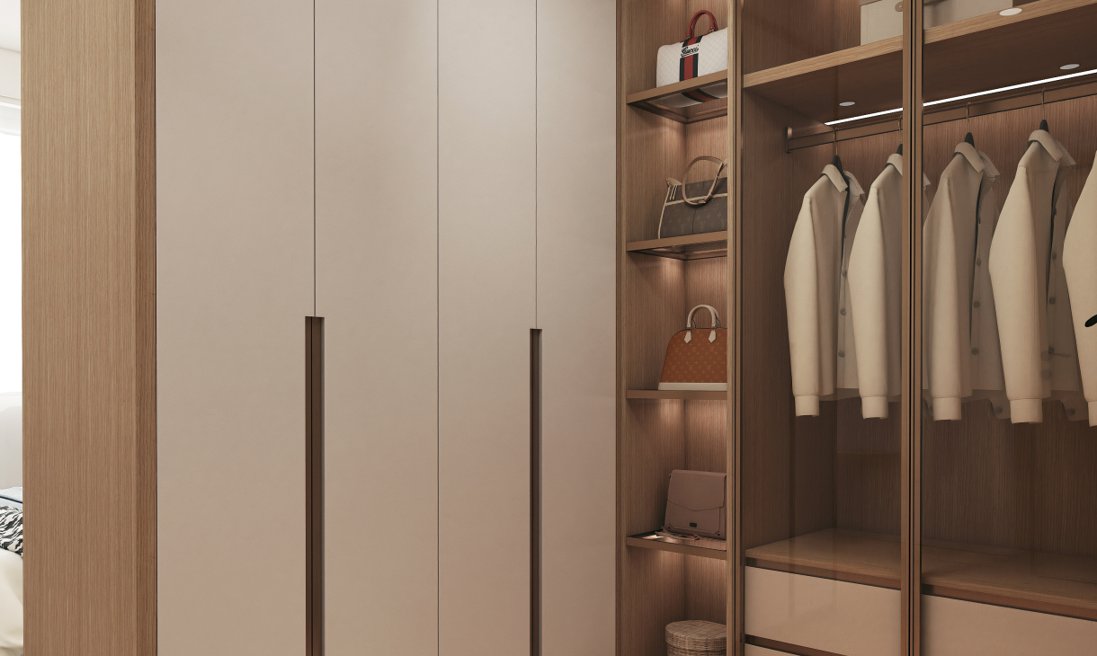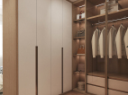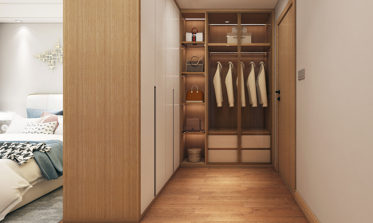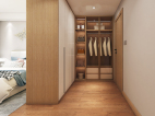 木色的線條搭配膚感系列的白色門板,靈動(dòng)的單元格搭配金屬玻璃層板,鋁框玻璃門經(jīng)行點(diǎn)綴,讓整個(gè)衣帽間富有儀式感。