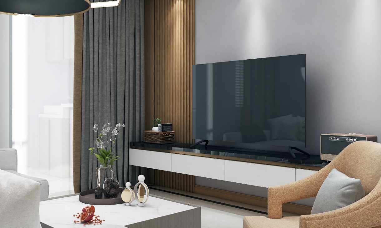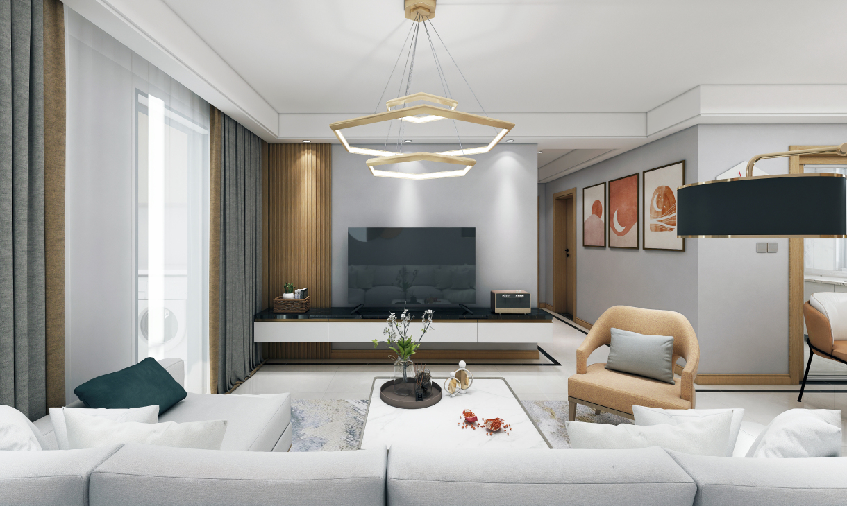 客廳簡(jiǎn)單的木格柵飾面搭配淺灰乳膠漆,單純的吊板臺(tái)面,讓整個(gè)空間顯得干凈純凈,沙發(fā)背景簡(jiǎn)單的燈光飾品,點(diǎn)綴墻壁,整個(gè)空間顯得無比寧?kù)o。