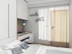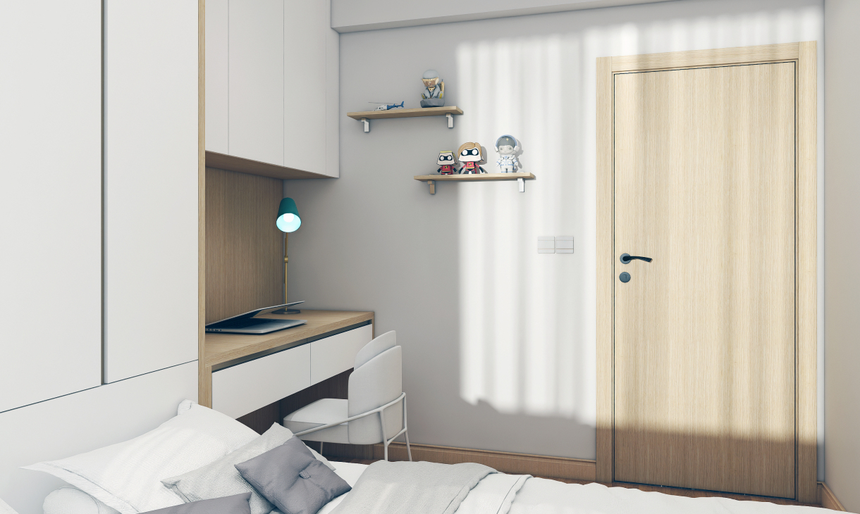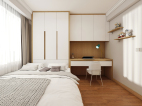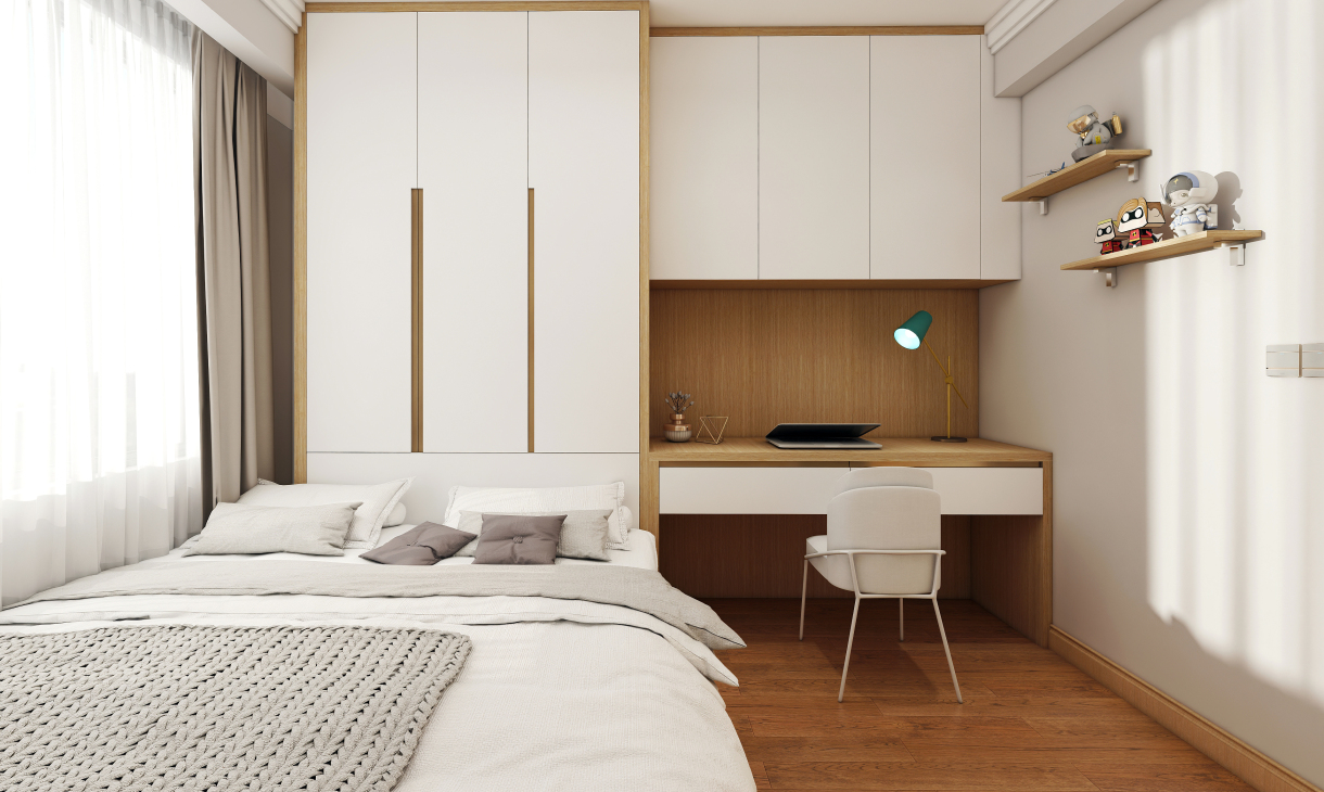 小孩房的設(shè)計(jì)略顯單調(diào),滿足她學(xué)習(xí)的同時(shí)兼顧生活,所以選擇榻榻米做床,榻榻米上衣柜和書桌吊柜形成一個(gè)整體,加上簡(jiǎn)單的隔板,讓整個(gè)空間靈動(dòng)起來。