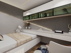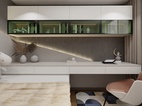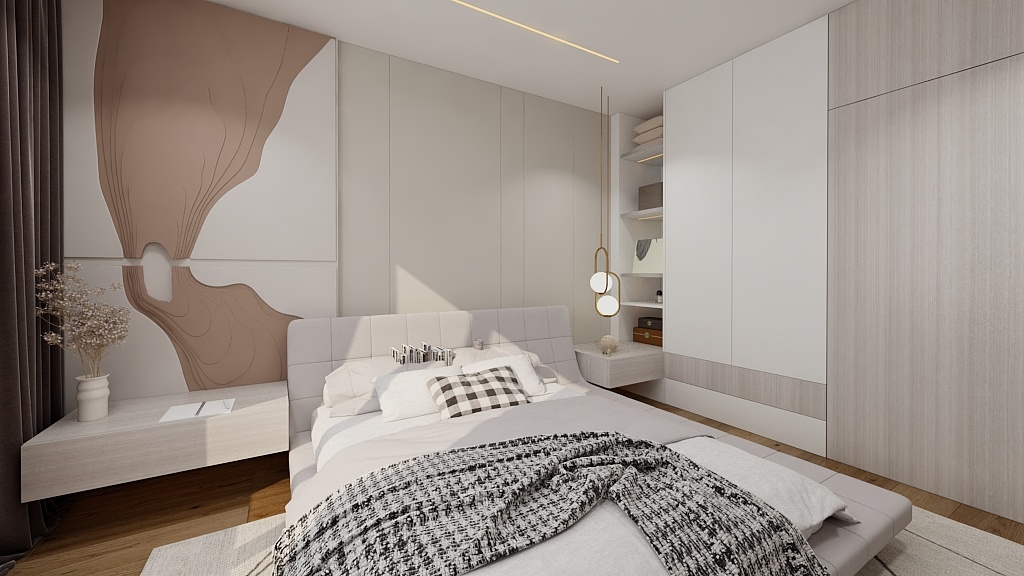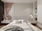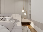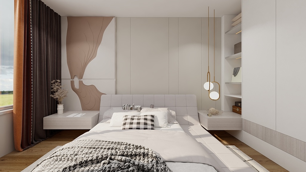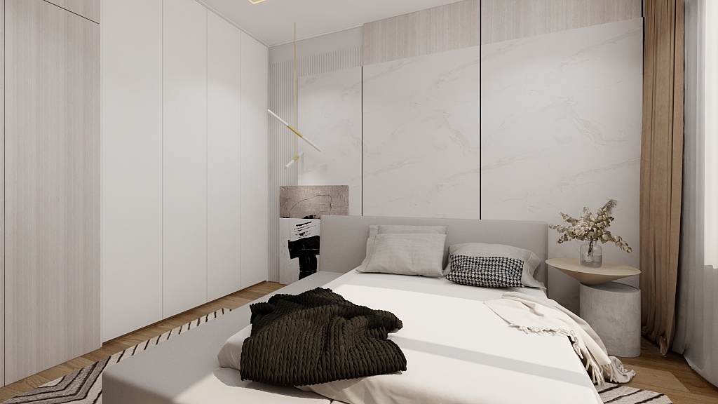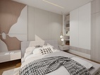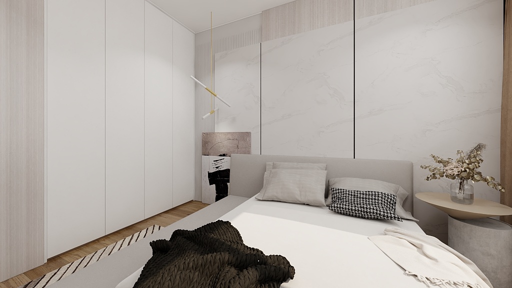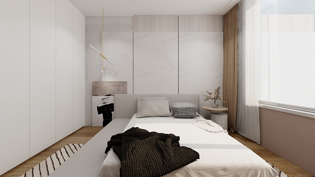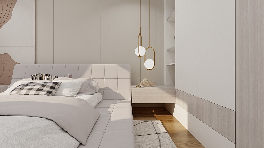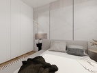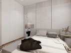 次臥增設白色收納柜上下通體門板,方便平時存儲物品。與背景墻呈L型排布,在滿足使用范圍的同時,將自然光線很好的引入進來,更顯整潔明亮。