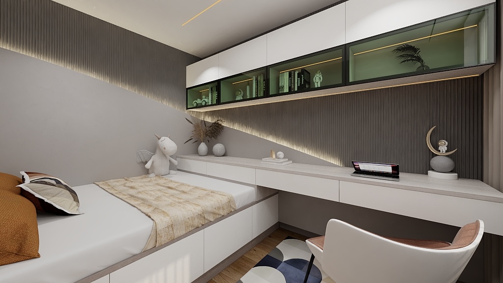 兒子房納入新空間后,室內擁有了更多使用可能性,于是設計師增設了兒童學習區(qū),讓家中的萌娃擁有獨立的學習成長空間。