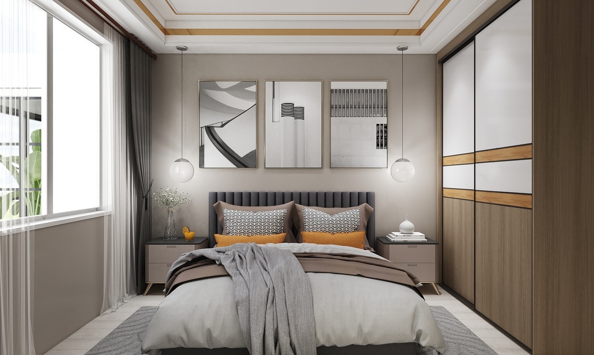 臥室的氛圍,中性而低調(diào),軟裝橙色的搭配,映射出年輕主人內(nèi)心的小獨(dú)特。