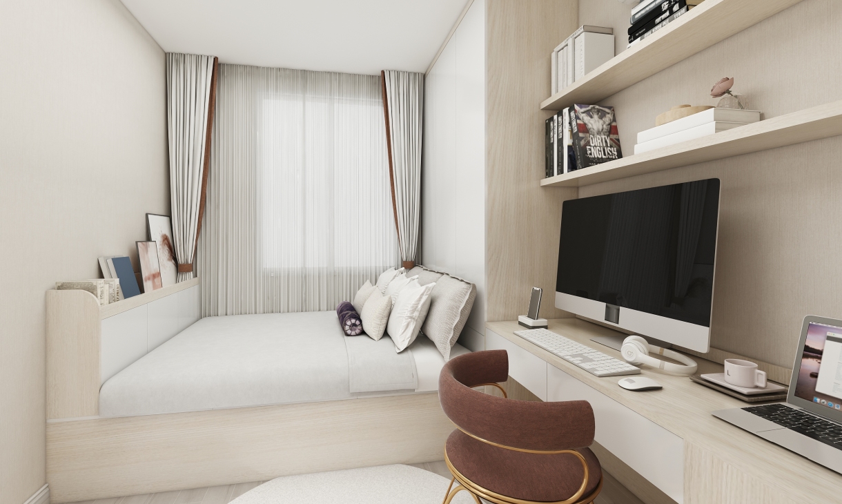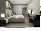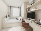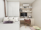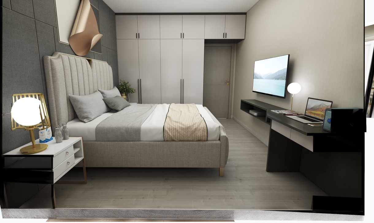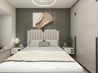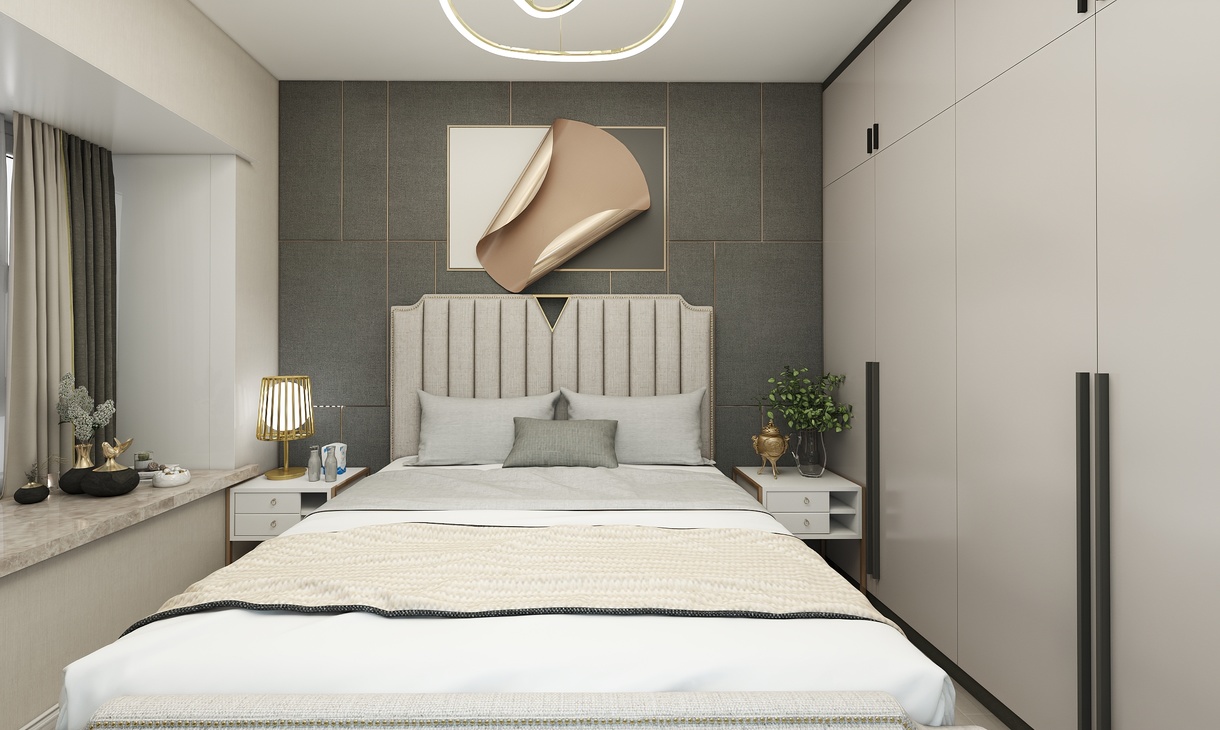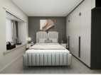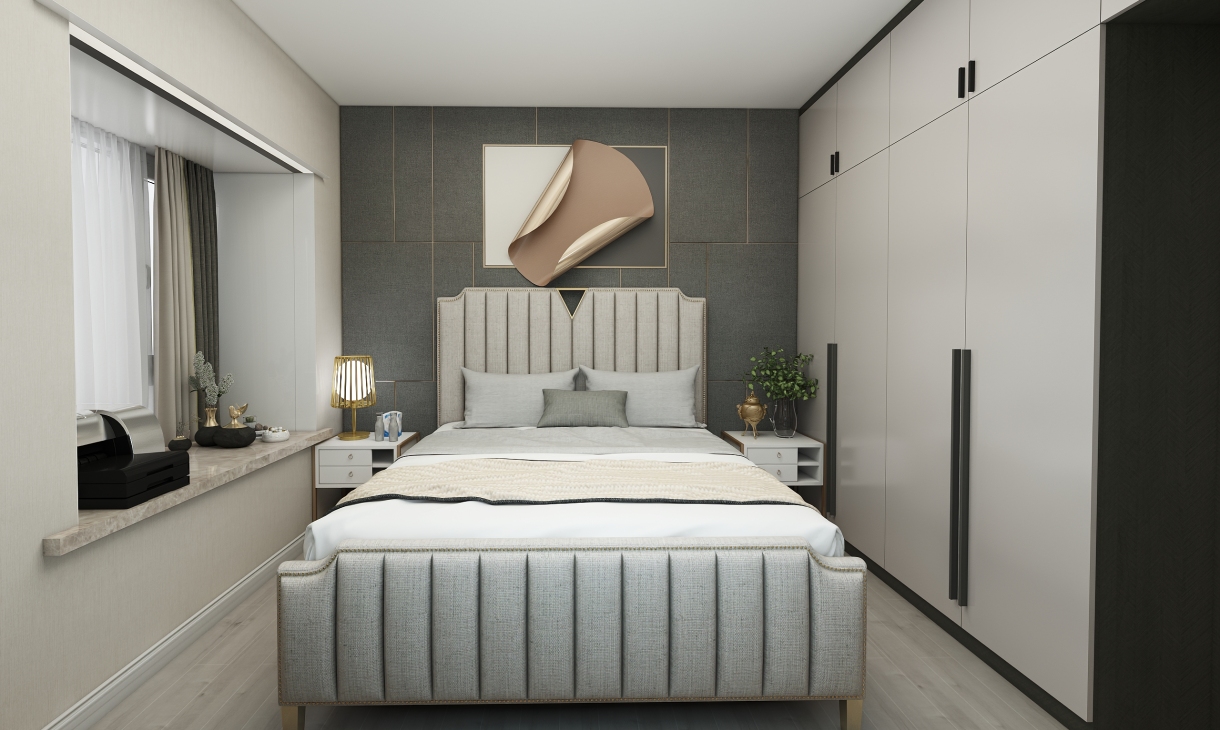 設(shè)計(jì)師利用灰色作為整個(gè)空間的主色調(diào),用純潔的白色打造出清爽寧靜的氛圍,床頭墻壁部分部分卻使用了灰色的pu線條,避免了沉悶,結(jié)合,傳達(dá)出不俗的混搭簡約的風(fēng)情與氣質(zhì)。