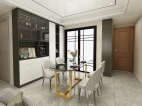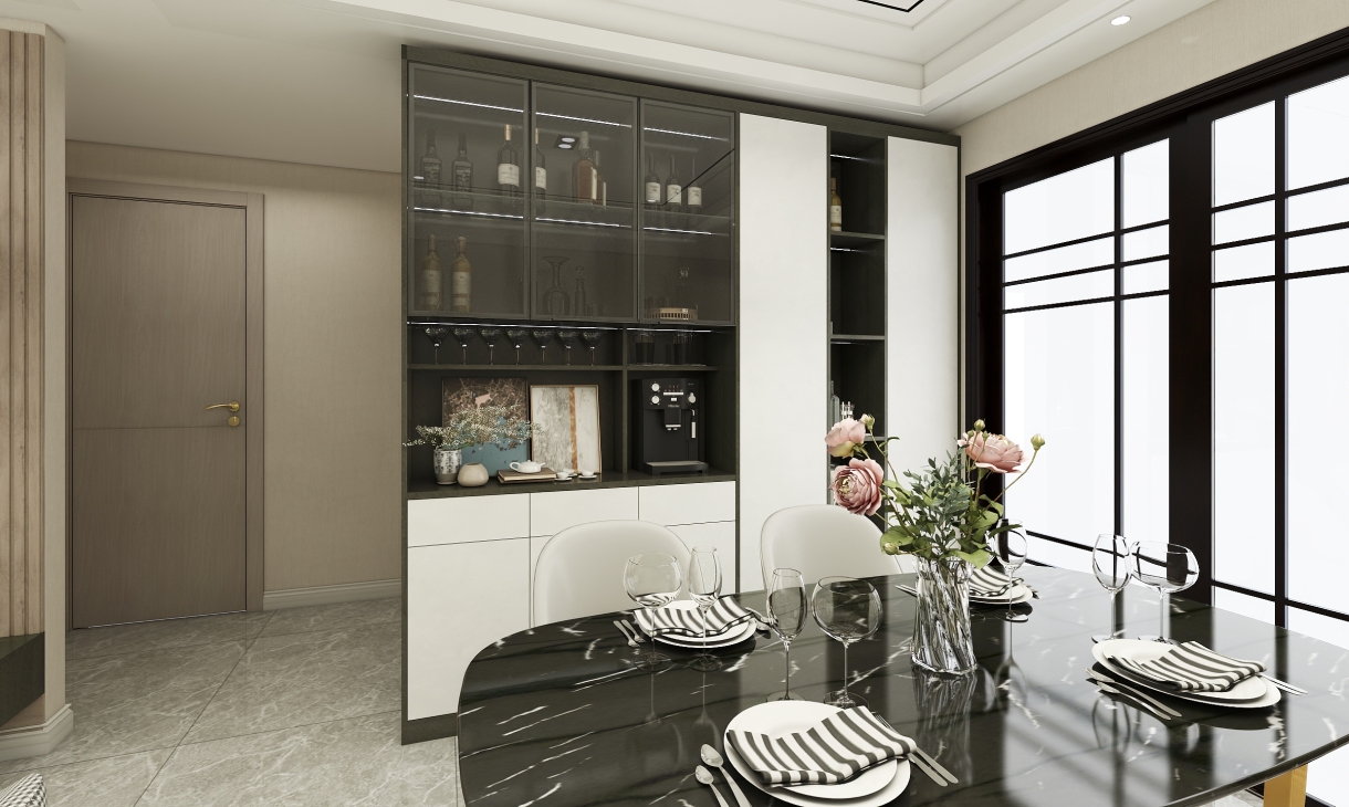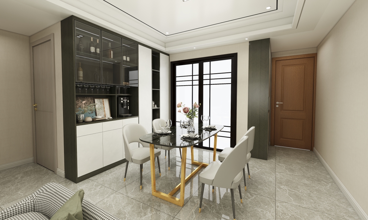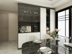 餐廳在視覺上舍棄張揚(yáng),通過金屬、皮革與金屬三種元素的融合,打造出一方輕奢的氣質(zhì)客廳??蛷d區(qū)域把沙發(fā)背后原有的墻打掉,做了柜子擺放,讓空間更完整。