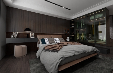 主臥步是帶衣帽間臥室,暖粉與白色的搭配,是柔軟與休閑的表現(xiàn)。吊頂內(nèi)圈的柵格豎紋,墻板材質(zhì)的框形回路,床頭軟墊的弧形紋路,飾品柜的金屬架,干凈利落的線條搭配豐富的紋理營造了整個空間的質(zhì)感