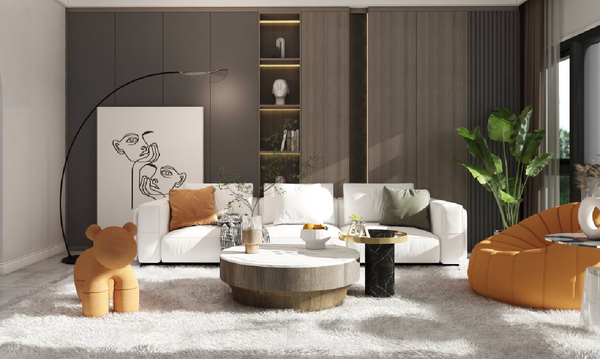 1.以木紋元素和石紋元素融入整體設(shè)計(jì)中,化繁為簡(jiǎn),以幾何與曲線的沖撞凸顯線條感,業(yè)主不想要太多凌亂的顏色,想要家中看上去質(zhì)樸卻又高檔。各個(gè)空間具有關(guān)聯(lián)性。2.將洗手臺(tái)外置設(shè)計(jì)豐富了衛(wèi)生間的使用空間,且通透的浴室鏡設(shè)計(jì)增加了玄關(guān)的空間感以及通透性,藝術(shù)雕塑的陳列更增添了一分藝術(shù)的色彩。3.整體為現(xiàn)代簡(jiǎn)約風(fēng),以木紋元素和石紋元素融入整體設(shè)計(jì)中,以幾何與曲線的沖撞凸顯線條感,異性沙發(fā)與茶幾在整個(gè)空間中格外吸睛。