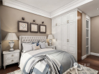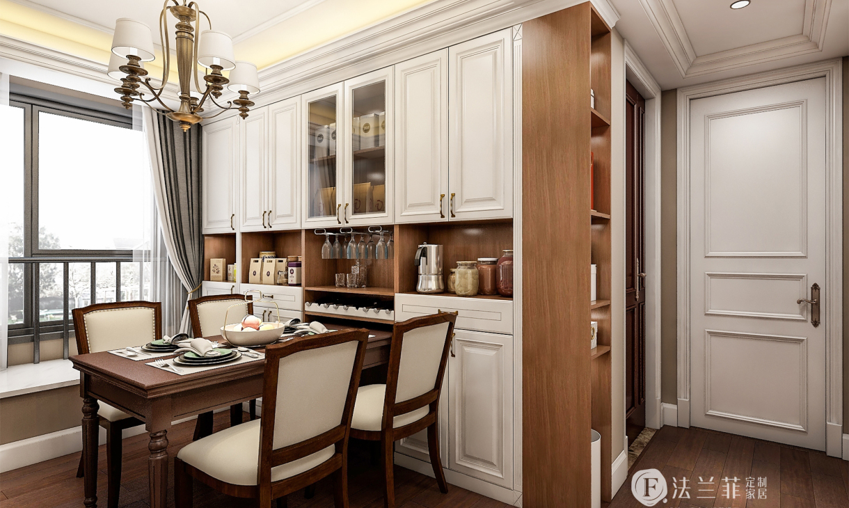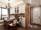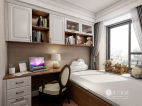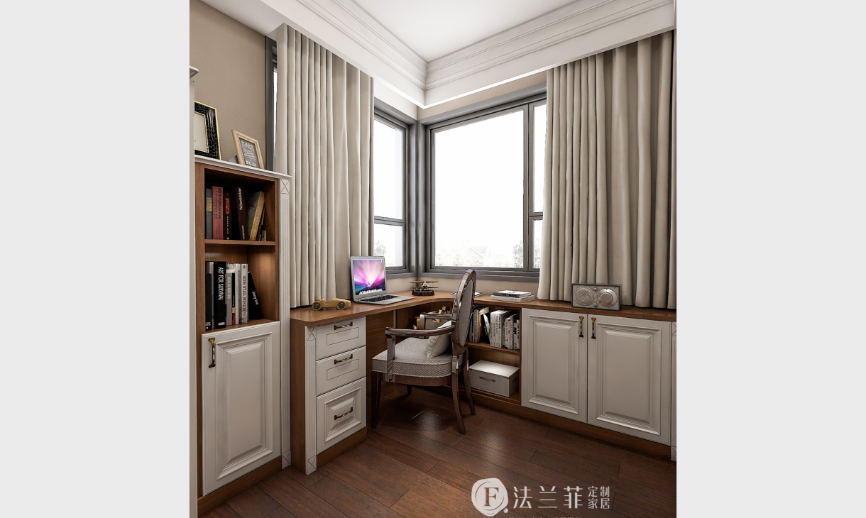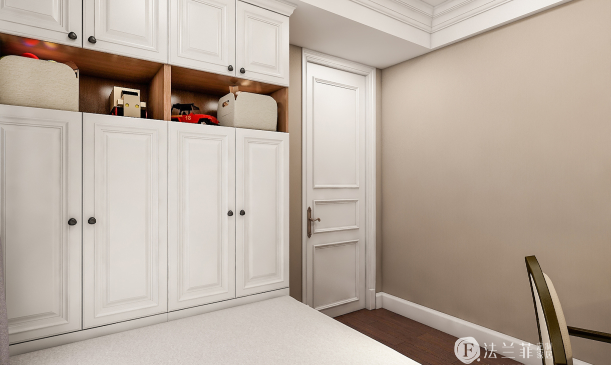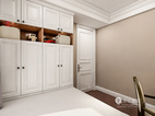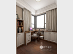 本方案為美式風(fēng)格,戶型為三房兩廳一廚兩衛(wèi)。餐廳的儲物柜跟餐桌相結(jié)合,讓空間的行走動線相對舒適。朝北的次臥,空間有限,作為書房使用,可以有充裕的采光。次臥用儲物柜做背景墻,加大了空間立面層次的同時,也加強(qiáng)了空間的收納機(jī)能。
