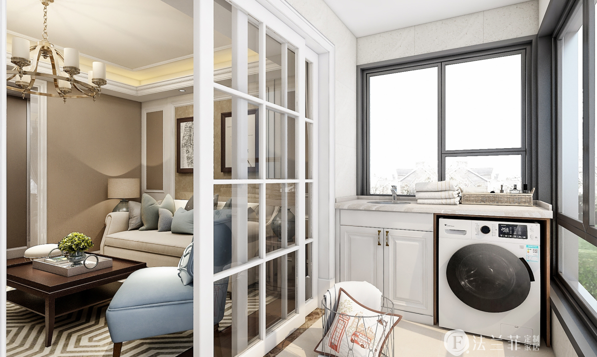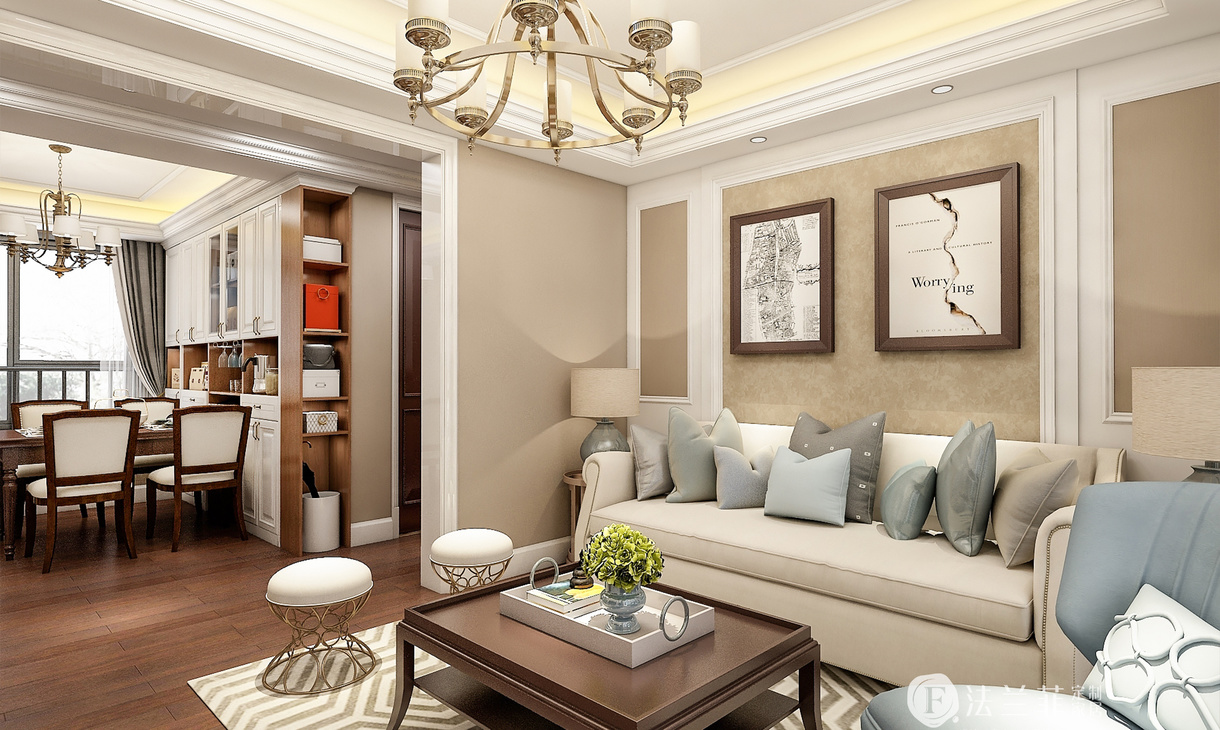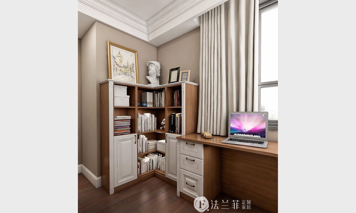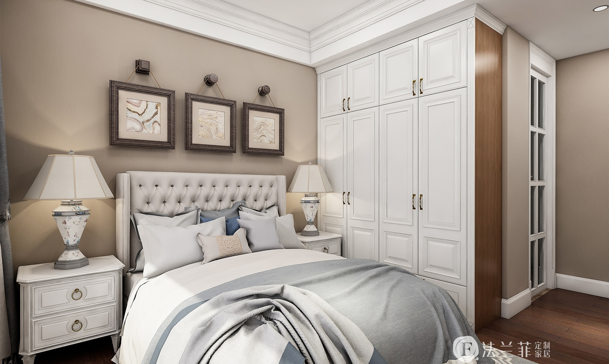 本方案為美式風(fēng)格,戶型為三房兩廳一廚兩衛(wèi)。餐廳的儲物柜跟餐桌相結(jié)合,讓空間的行走動線相對舒適。朝北的次臥,空間有限,作為書房使用,可以有充裕的采光。次臥用儲物柜做背景墻,加大了空間立面層次的同時,也加強(qiáng)了空間的收納機(jī)能。