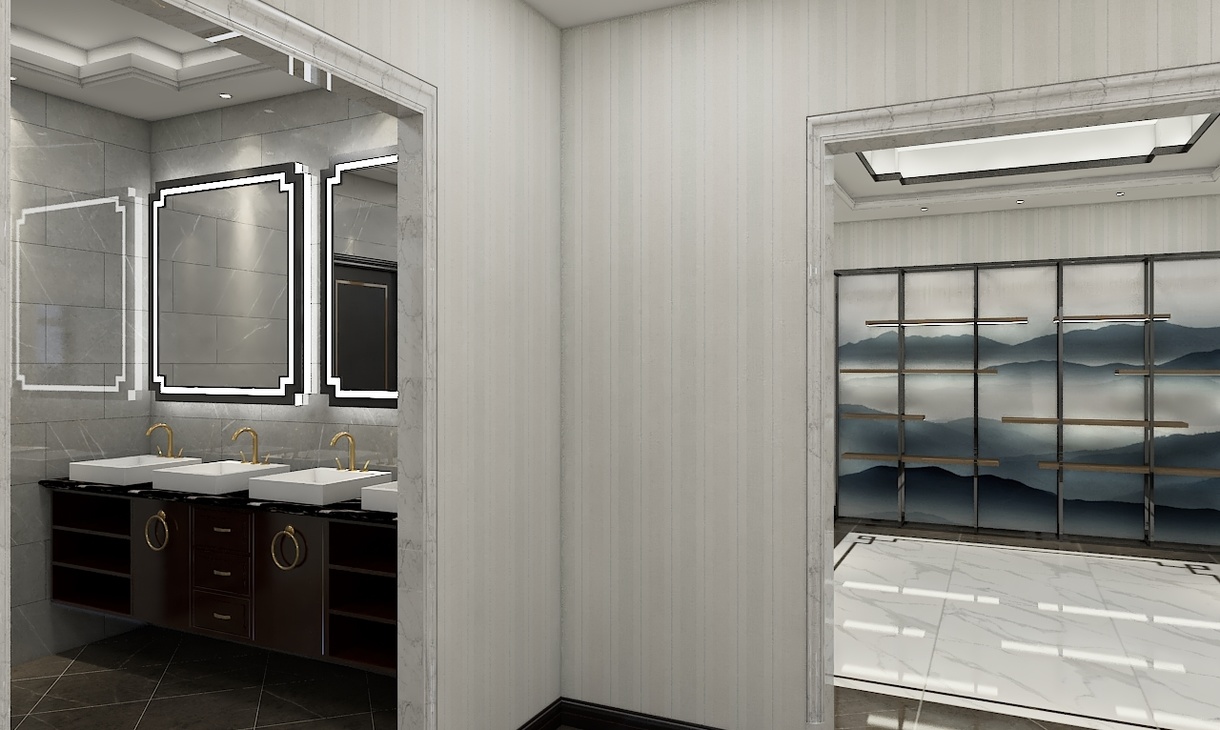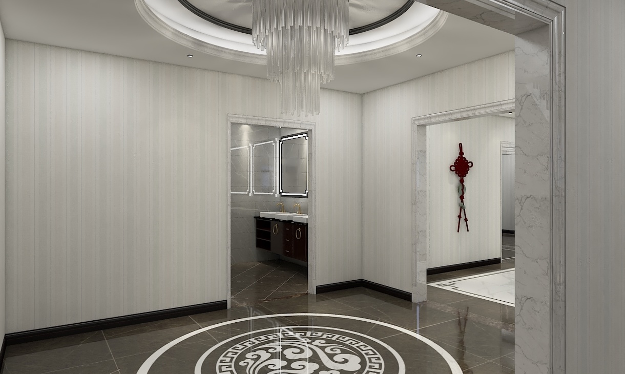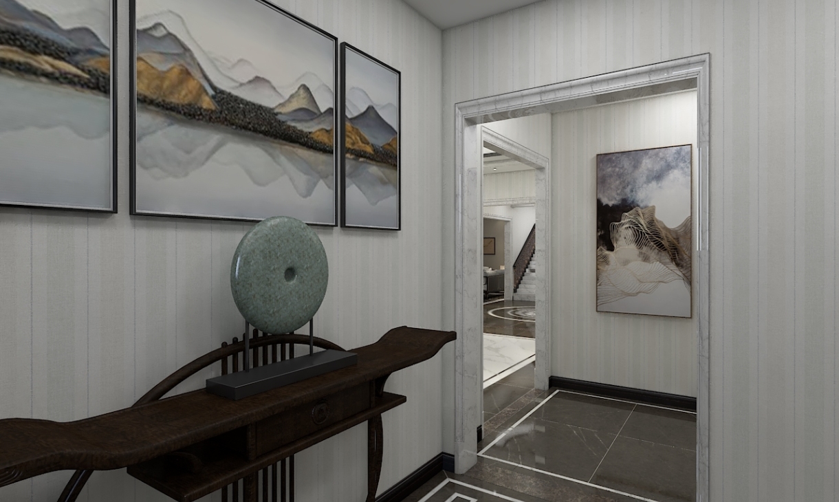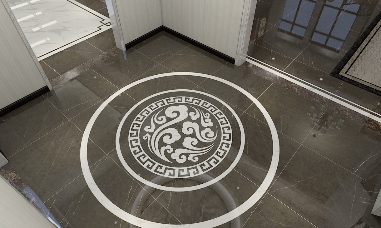 顧客偏好:客戶(男性)年齡在50歲左右,人生閱歷豐富,品味高雅,崇尚中國傳統(tǒng)文化,追求雅致靜謐的生活方式;經(jīng)商數(shù)十載,青蔥歲月也曾經(jīng)歷過風(fēng)塵的洗禮,內(nèi)心深處卻不曾被世俗塵封起來,在裝修風(fēng)格的選擇上一直對時下非常流行的新中式風(fēng)格情有獨鐘,特此委托我方進(jìn)行瓷磚方面的搭配,給予別墅一層重點區(qū)域的效果展示。 設(shè)計理念:在不同空間的組織上,塑造節(jié)奏感,讓城市的繁華與歸隱的閑適之間,找到一種平衡點。提取傳統(tǒng)中式文化的精華,注入現(xiàn)代生活之中,通過空間的營造,傳遞一種低調(diào)奢華,簡約貴氣之美。從而在繁華的城市之中便可感悟山水的樂趣。 作品亮點:突破傳統(tǒng)搭配模式-本案采用主磚深色搭配淺色做簡單造型,達(dá)到劃分區(qū)域的目的,在整體空間上各有不同更加富有層次感;去繁從簡,配色也只用到一款石材感紋理突出的白色雪域石,立體感豐富,一石7面的出眾效果深得客戶之心。