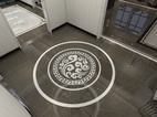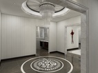 休閑廳空間上采用呼應(yīng)的設(shè)計手法,圓頂配有一盞霸氣的水晶吸頂燈,地面瓷磚拼圖設(shè)計一副祥云圖與之交相呼應(yīng),是吸睛之筆,也是客戶最滿意的一種處理方式。