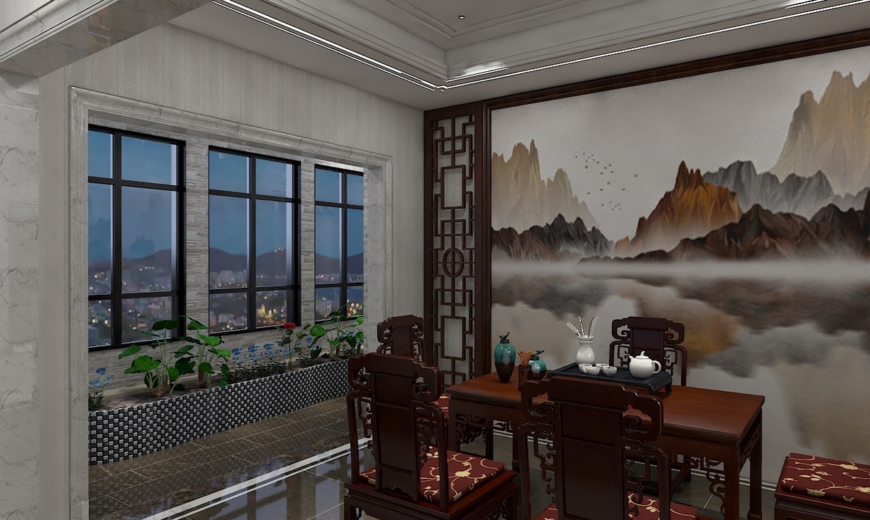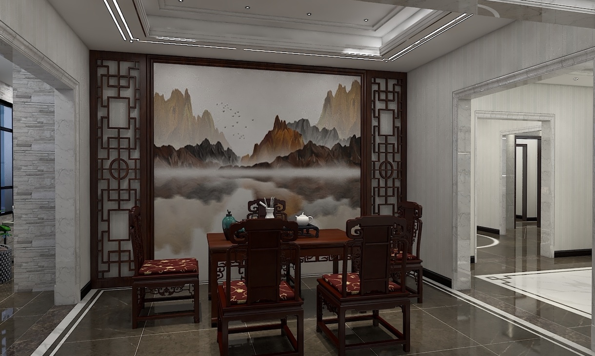 空間的設(shè)計上運用中式元素教濃厚一些的木質(zhì)柵格及印象派山水圖作為主體背景,茗茶廳是招待客人的重要場所,嚴(yán)肅感是不可缺失的。