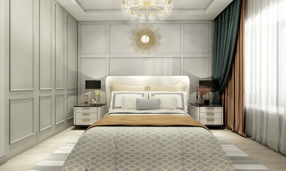 美式輕奢的風(fēng)格,護(hù)墻板的獨(dú)特設(shè)計(jì)搭配輕奢高床,簡約不失時(shí)尚