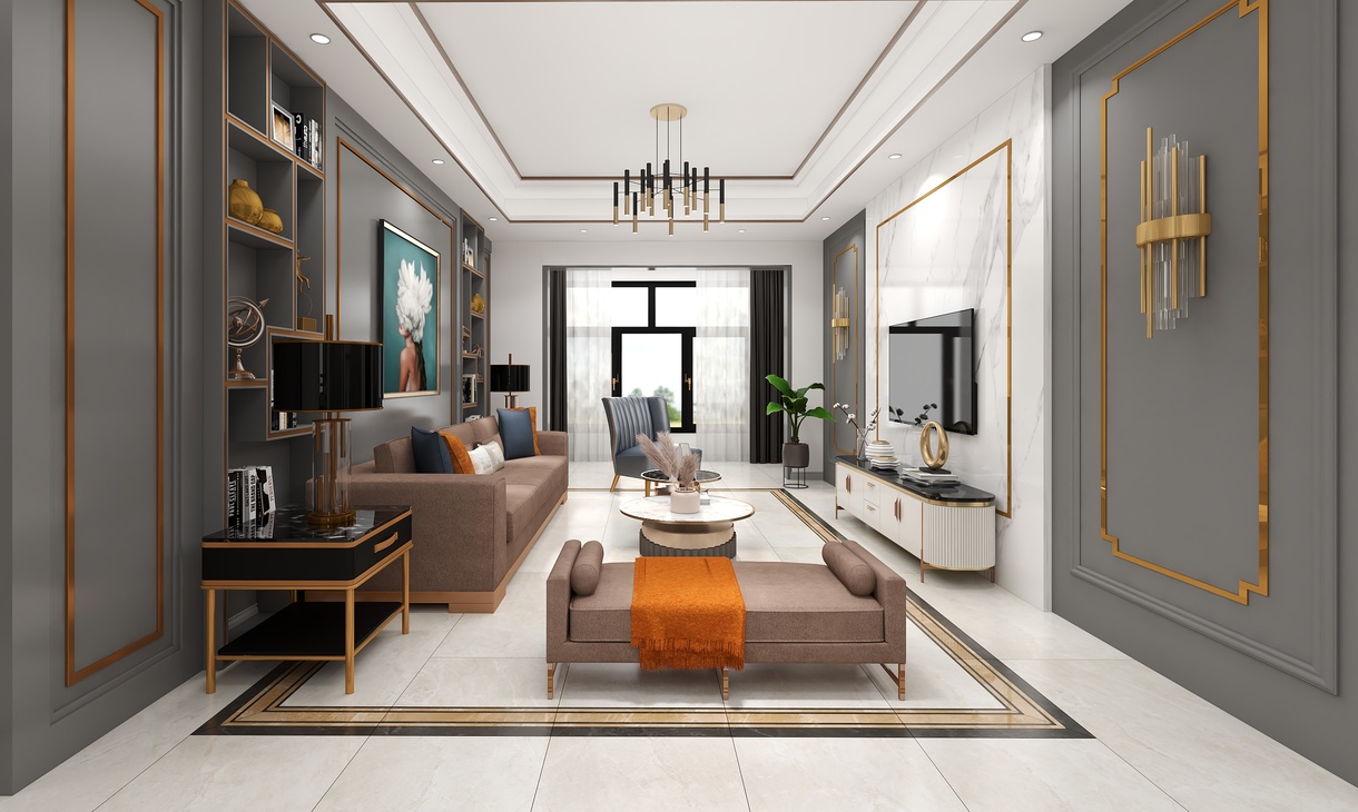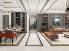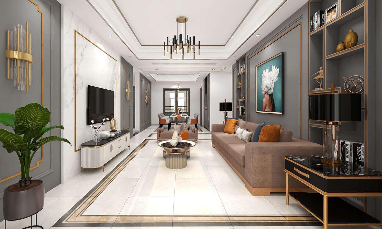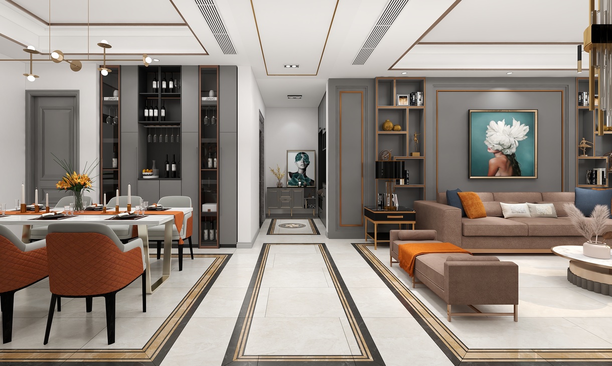 公區(qū)地面都用深灰色“星河會”系列和暖色系的“童白云巖”系列做波打線裝飾,分割區(qū)域。搭配時尚灰的墻面,更顯層次~