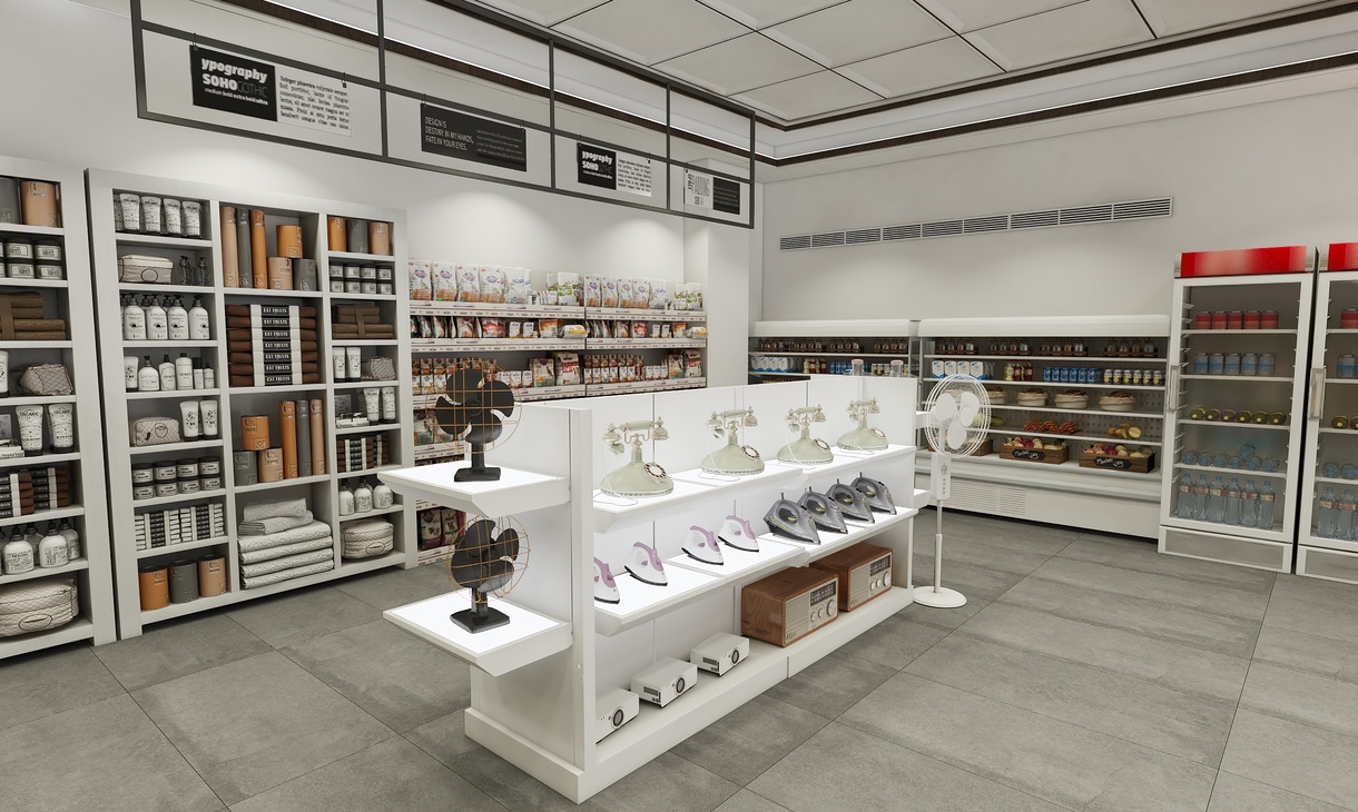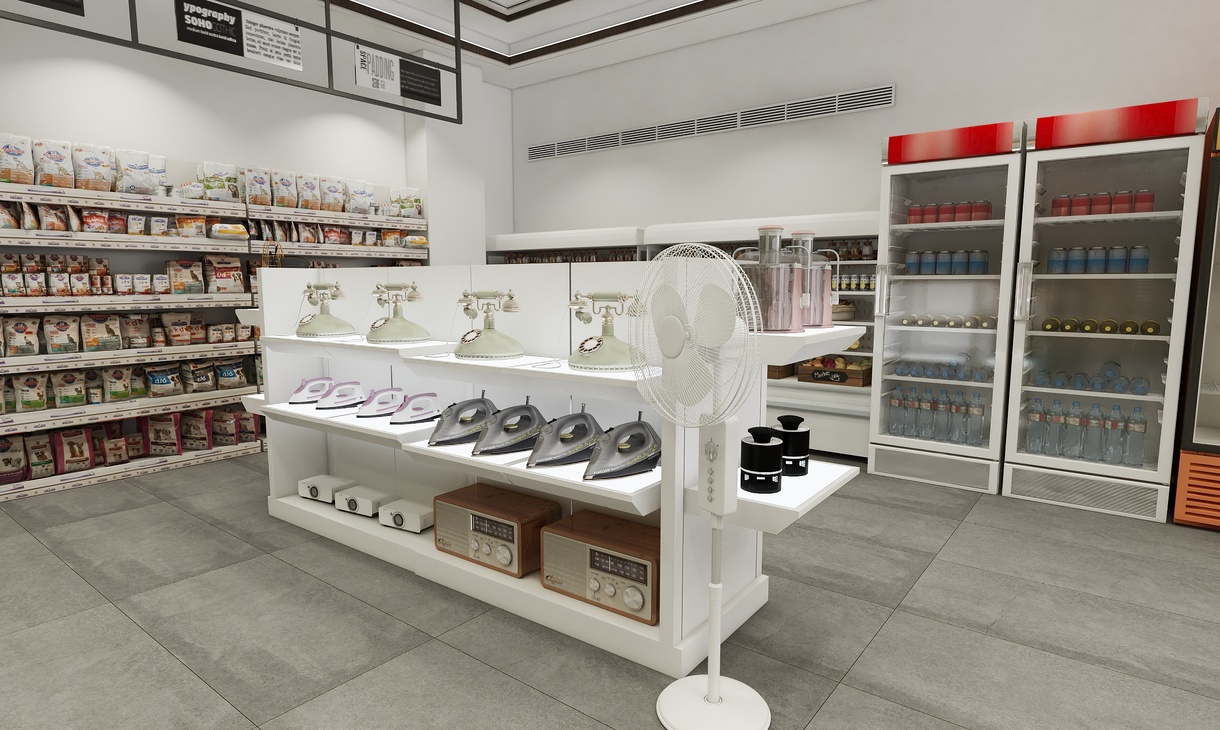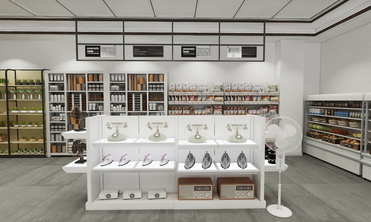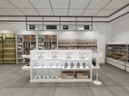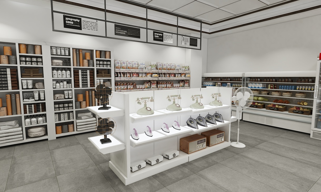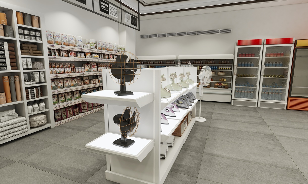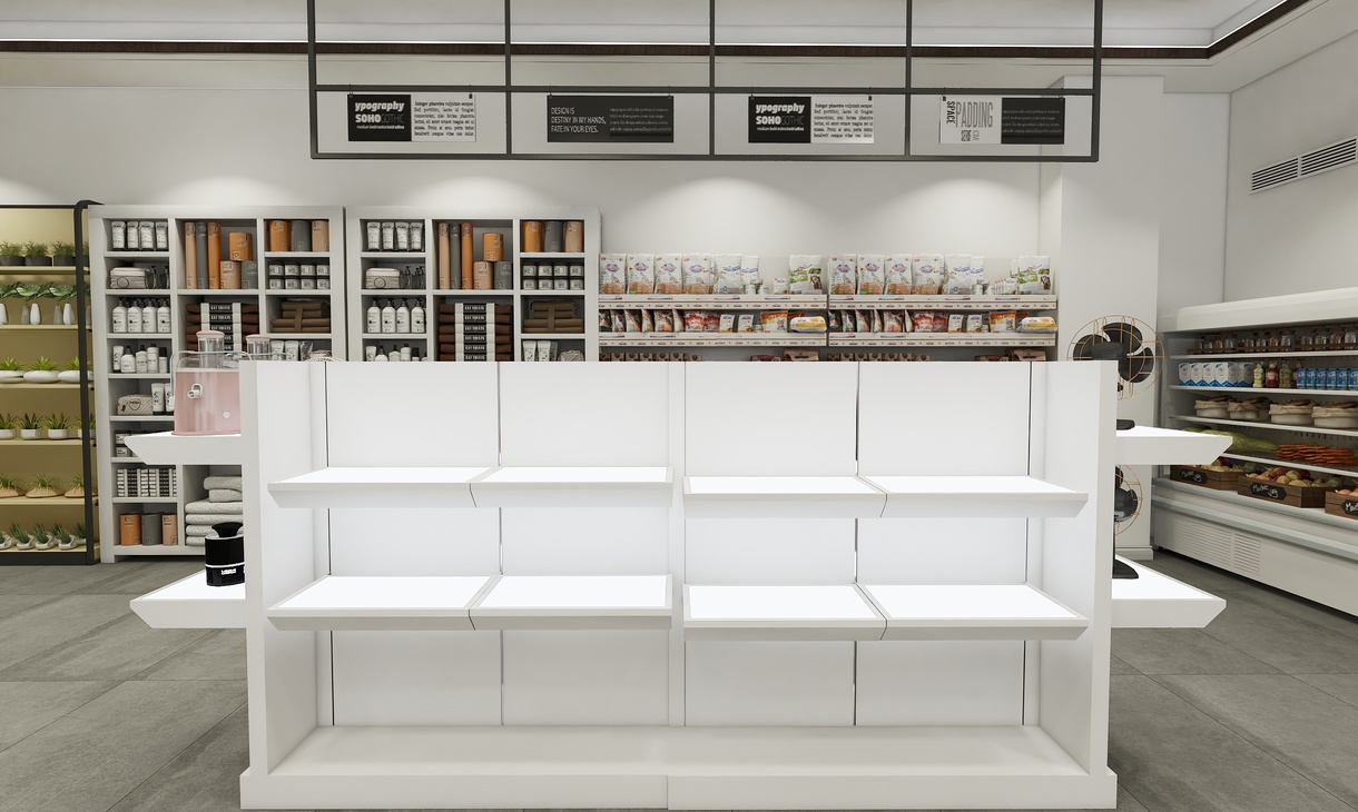 采用新品商超架子,擺放各種商品裝飾展示效果