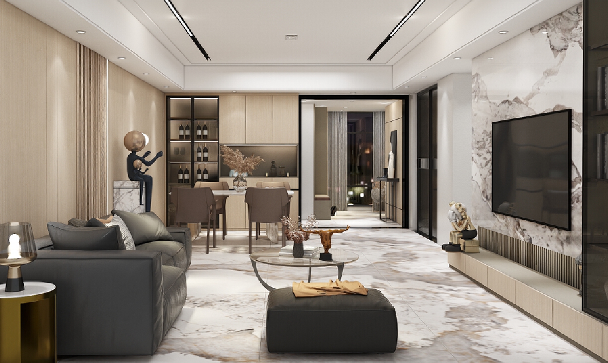 在這個(gè)接近極簡(jiǎn)的現(xiàn)代空間中,使用多種設(shè)計(jì)元素與之相搭配,大理石、木質(zhì)、布藝,簡(jiǎn)約的色調(diào)將他們糅合統(tǒng)一,創(chuàng)造出一種雅致舒適的獨(dú)特氛圍。