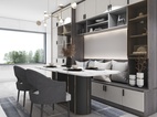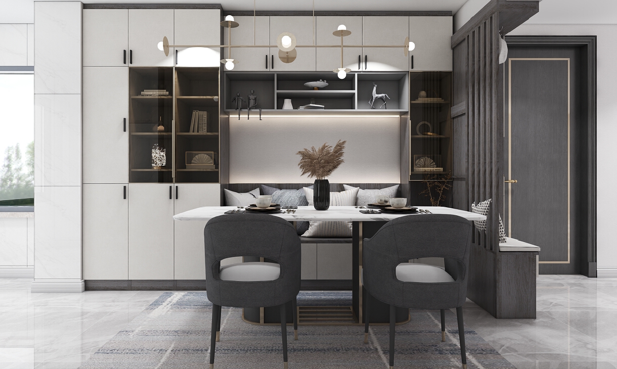 餐廳加入了卡座的設(shè)計元素,搭配玻璃酒柜和裝飾吊燈,使空間的氛圍煥然一新。燈具的造型十分具有設(shè)計感,材質(zhì)的拼合,線條的紛繁復(fù)雜,讓空間充滿了層次感與餐廳的精致感。