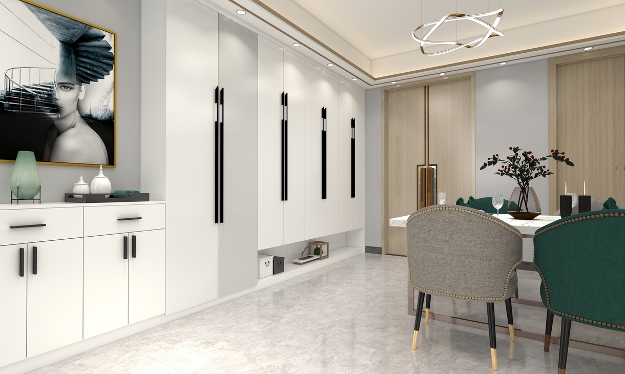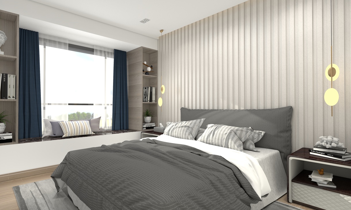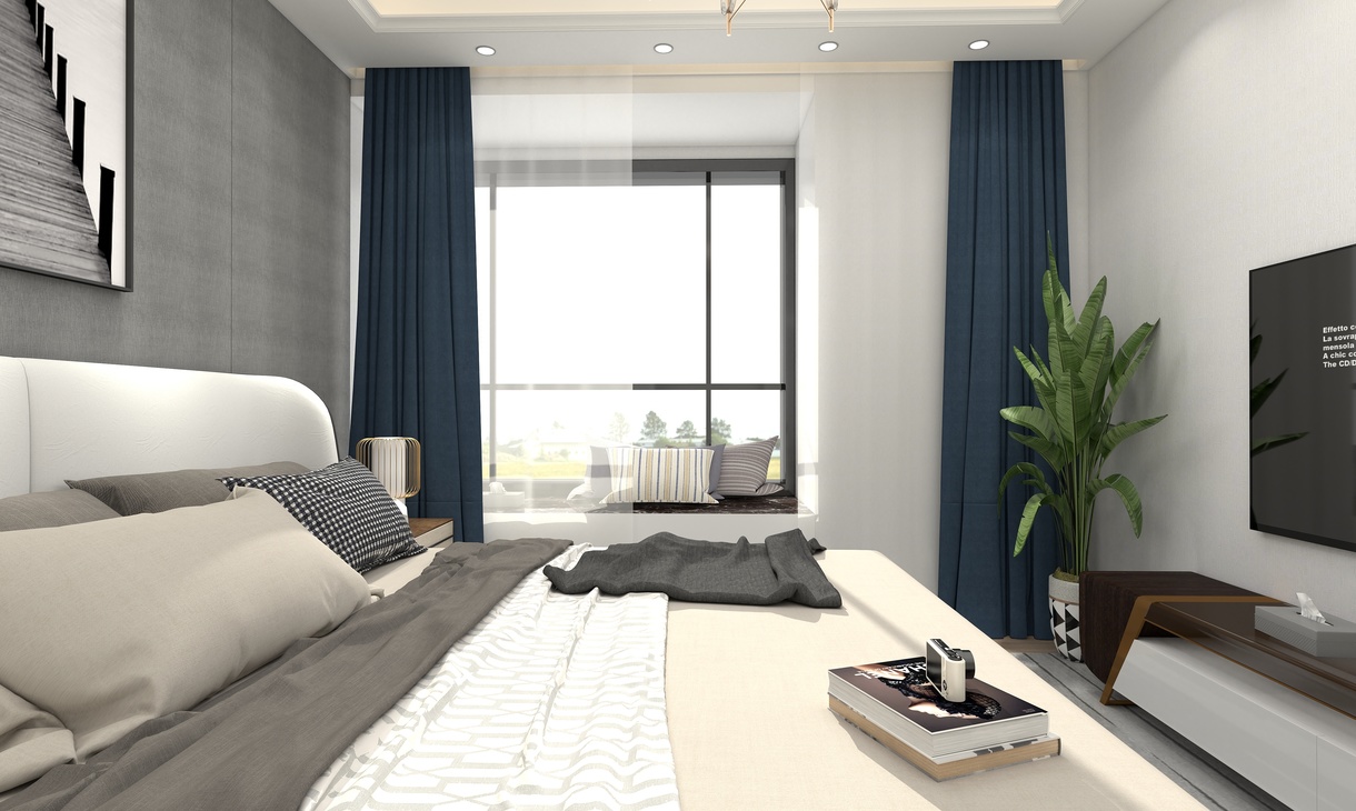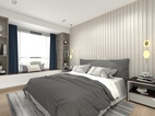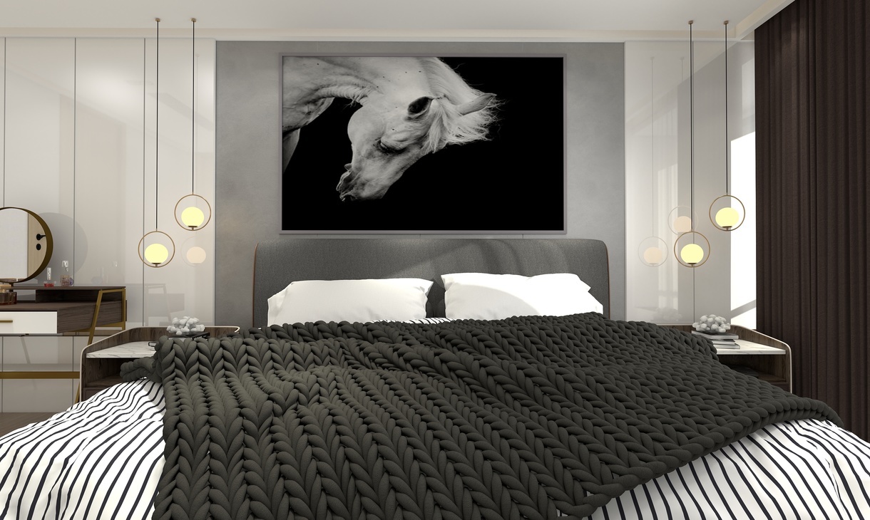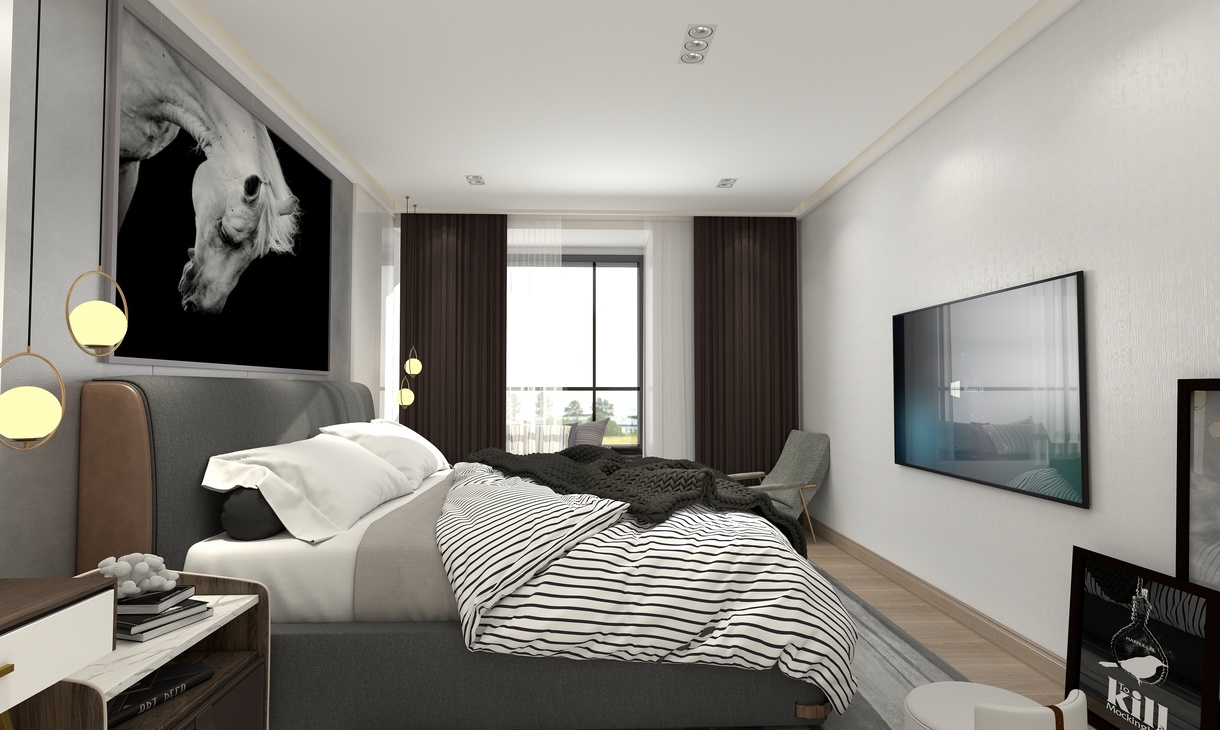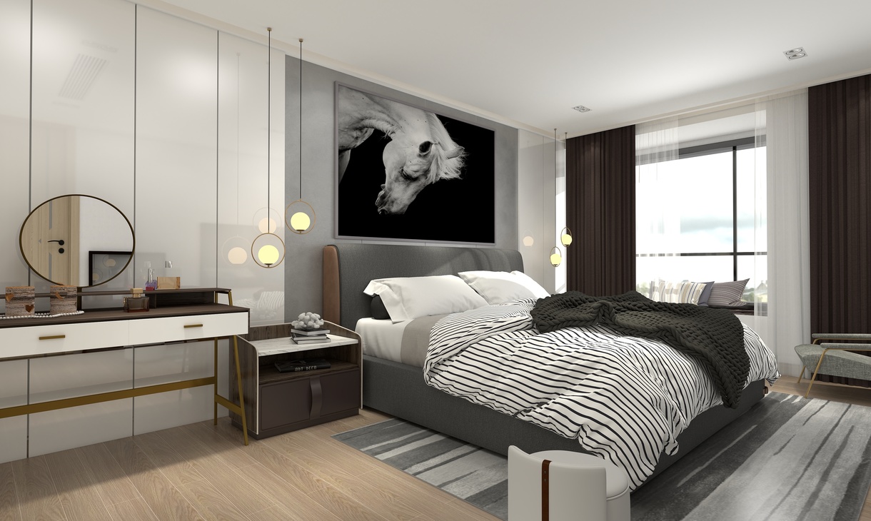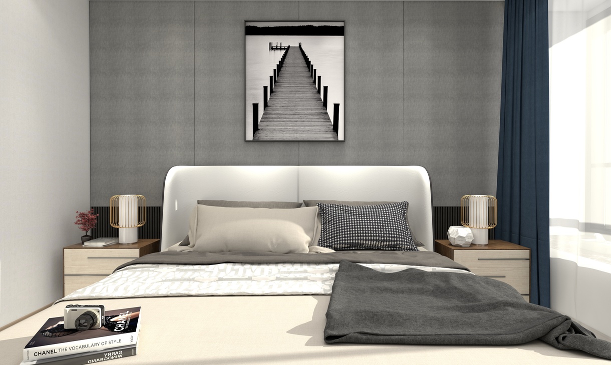 本案的主題為現(xiàn)代輕奢風(fēng)格,簡(jiǎn)約俐落的質(zhì)材鋪敘與敞明大方的格局尺度在案例中設(shè)計(jì)師以陳設(shè)藝術(shù)品及金屬線條材質(zhì)來營造大氣、自然、輕奢的裝飾美學(xué)氛圍。墻面、地面、家具陳設(shè)等均以簡(jiǎn)潔的造型、精細(xì)的工藝為其特征,強(qiáng)調(diào)品質(zhì)感和細(xì)節(jié)處理。在色彩搭配方面以冷色為主,溫馨的方桌桌花束、白色的搭毯、直觀大氣的金屬材質(zhì),帶著淡淡的隨意,隨著輕輕的希冀讓人感受到的是空間彌漫的溫馨與舒暢。臥室高雅自由的空間,充滿了唯美的想象。色彩搭配上灰白色為主基調(diào)色,在淺色的空間里點(diǎn)綴了鮮艷的黃色、冷淡的藍(lán)色,變得更加有活力性。設(shè)計(jì)師毫不吝嗇的用心,大到有氣勢(shì)感的沙發(fā)床,小到床頭背景的精致掛飾,都是經(jīng)過精心的搭配,完成業(yè)主心中對(duì)于浪漫情懷的解讀。