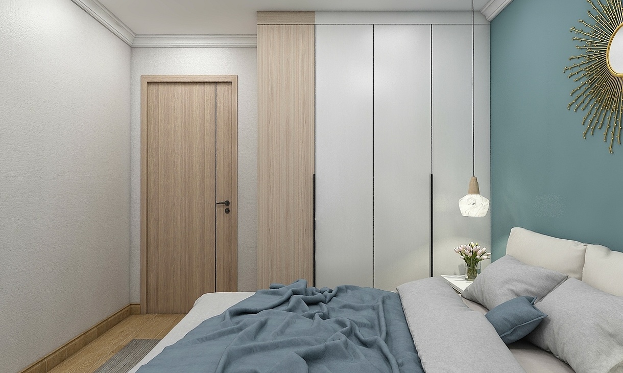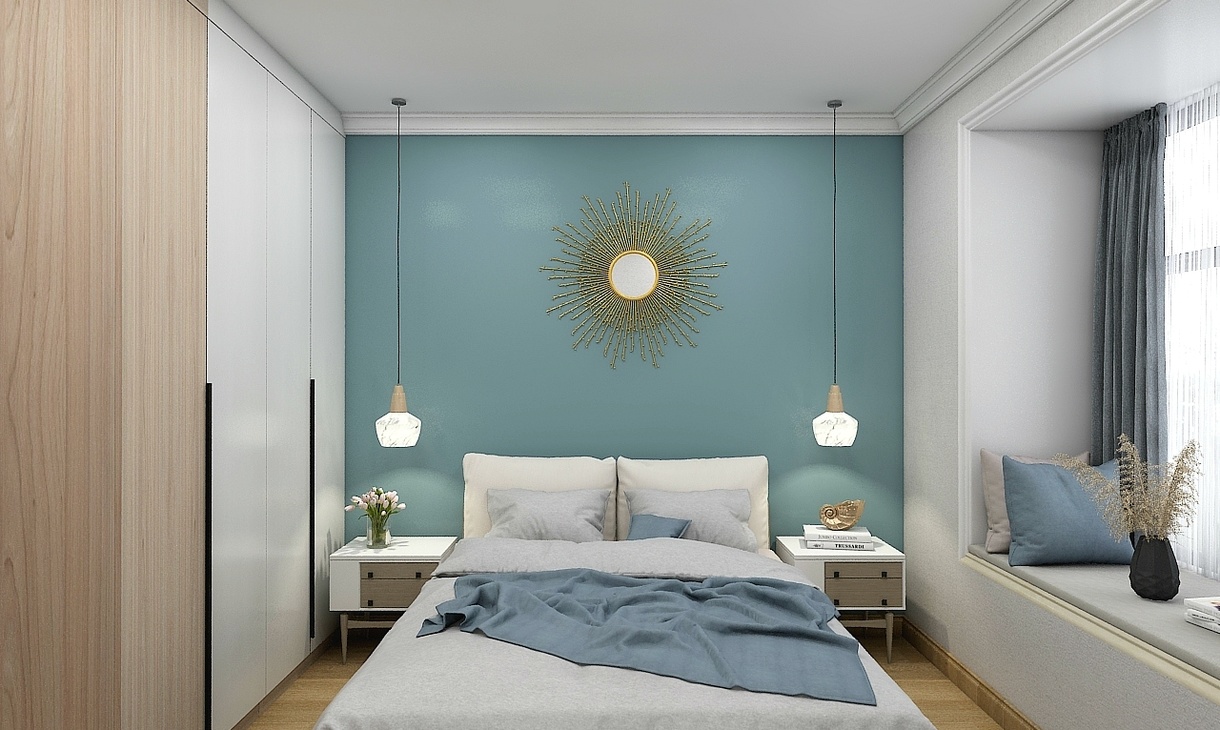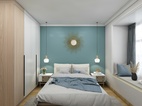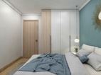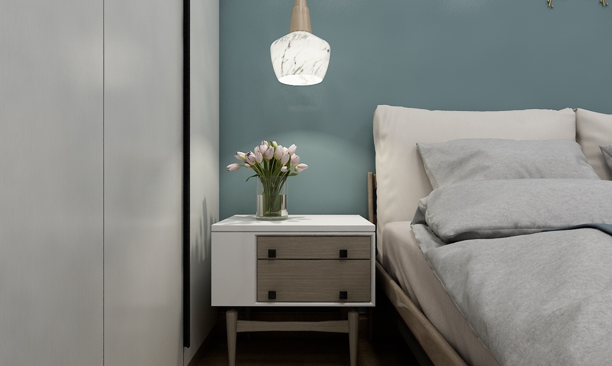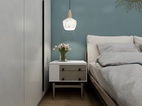 主臥以灰藍(lán)色作為背景墻,體現(xiàn)出主人的素雅大方的品味;柜體采用原木色和白色,讓整個(gè)空間更加和諧!