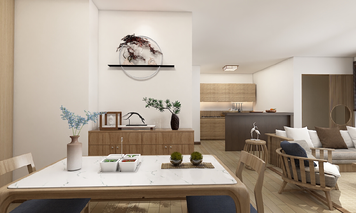 溫暖的簡普的場景使人放松,家具與布藝完美結(jié)合了布藝和原木的自然親和感,就餐區(qū)與休閑區(qū)才用花藝中的櫻花裝飾,將休閑與就餐完美分離出來。簡約而自然的軟裝陳列,給人一種返璞歸真的生活氣息。