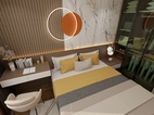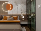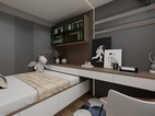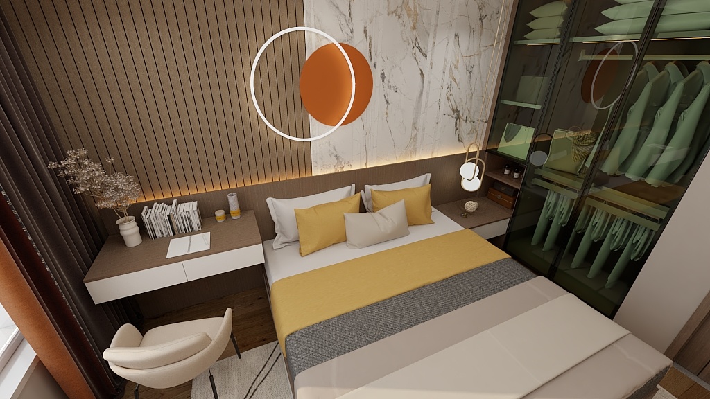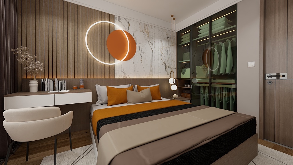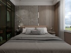 這個(gè)房間是業(yè)主給父親預(yù)留的臥室,由于面積狹小,所以我們將床靠邊并做了嵌入式衣柜設(shè)計(jì)。獨(dú)立的懸空床頭柜設(shè)計(jì),使空間得到充分運(yùn)用,也不會(huì)讓房間顯得壓抑。