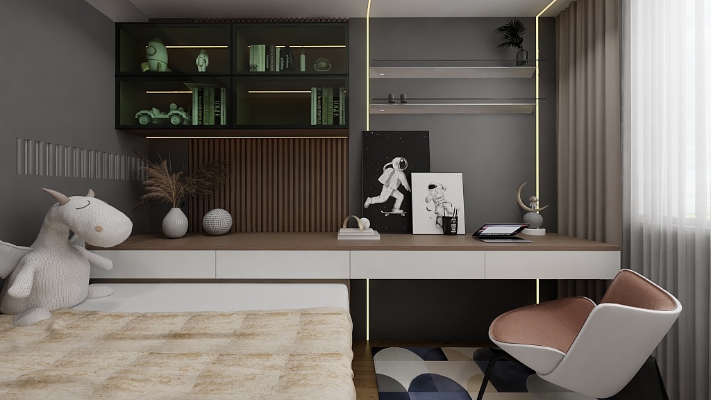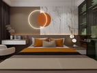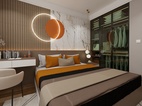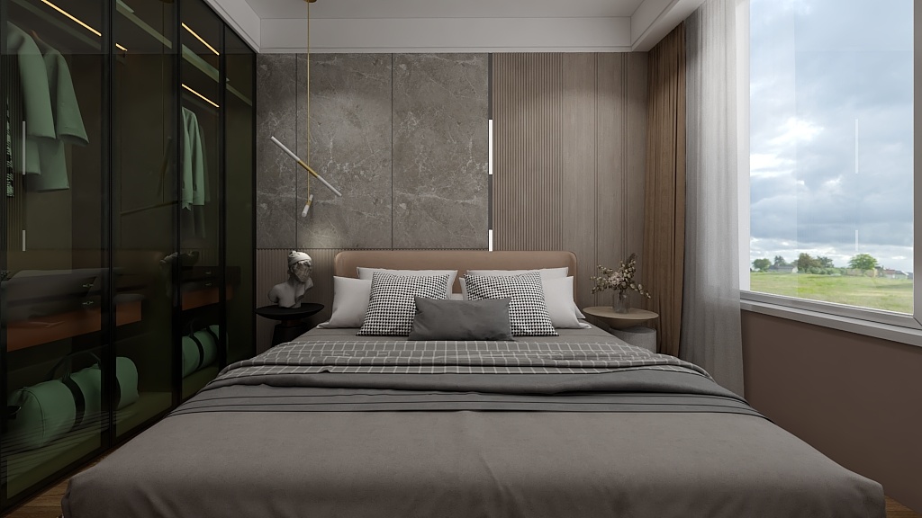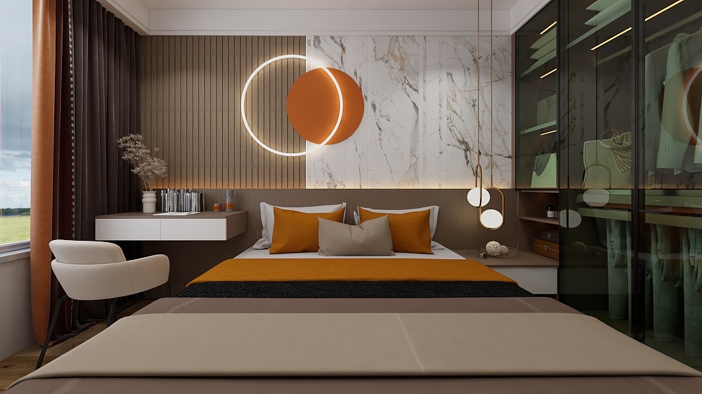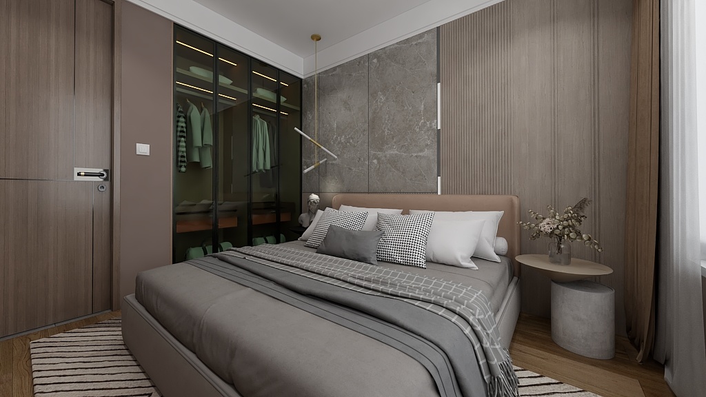 主臥通過墻面的凹凸設(shè)計(jì)在床側(cè)面加入了大衣柜,保留了空間進(jìn)深。床頭氛圍墻線燈往上洗墻,加上窗簾反光燈槽的氛圍烘托,溫馨氣息伴你入眠。