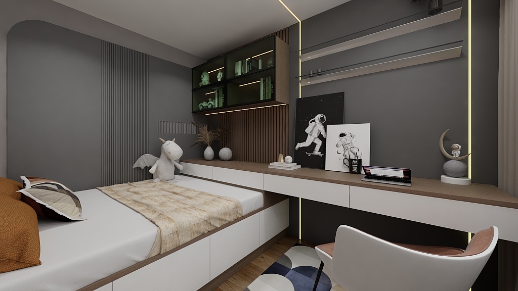 南面的第二個(gè)臥室作為未來的兒童房,當(dāng)下可以作書房使用。榻榻米床在我們的設(shè)計(jì)案例中多次運(yùn)用,但每個(gè)案子也都會(huì)結(jié)合空間及屋主的使用需求進(jìn)行調(diào)整。