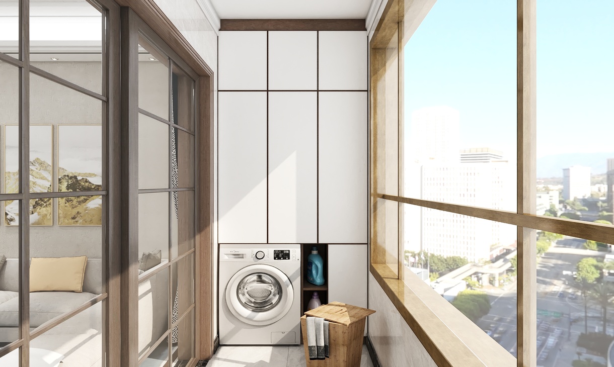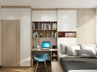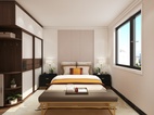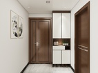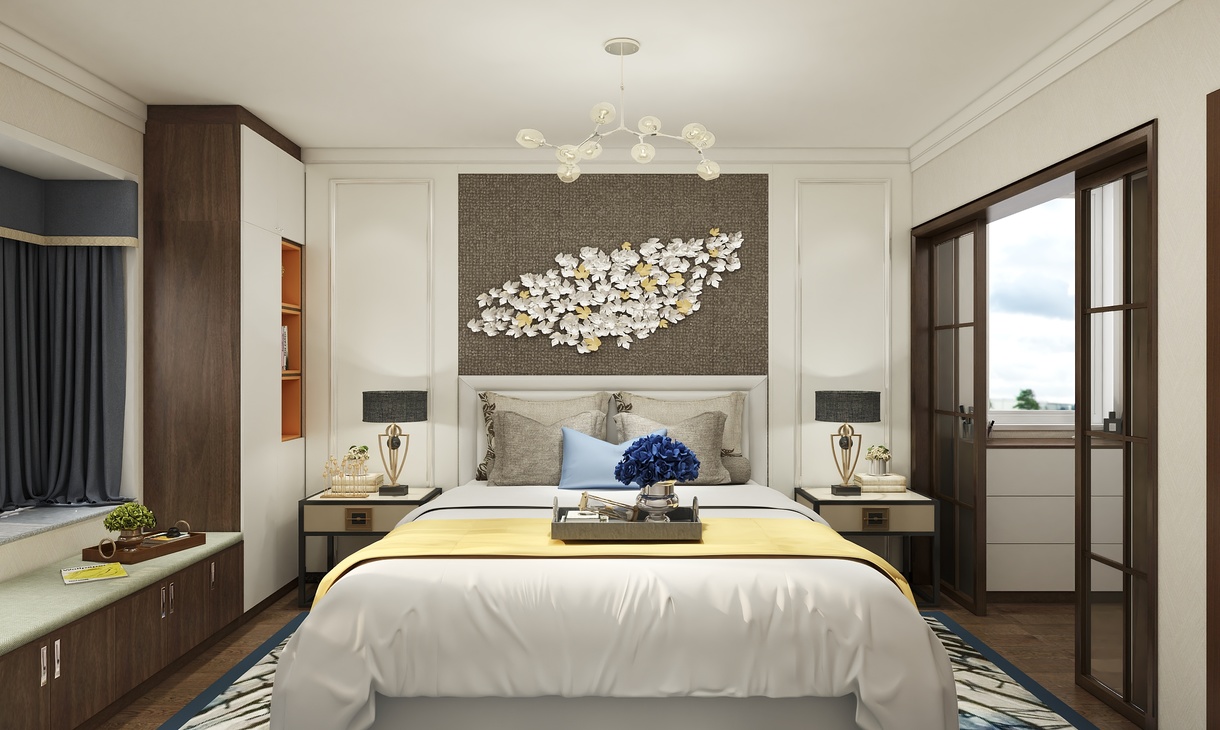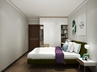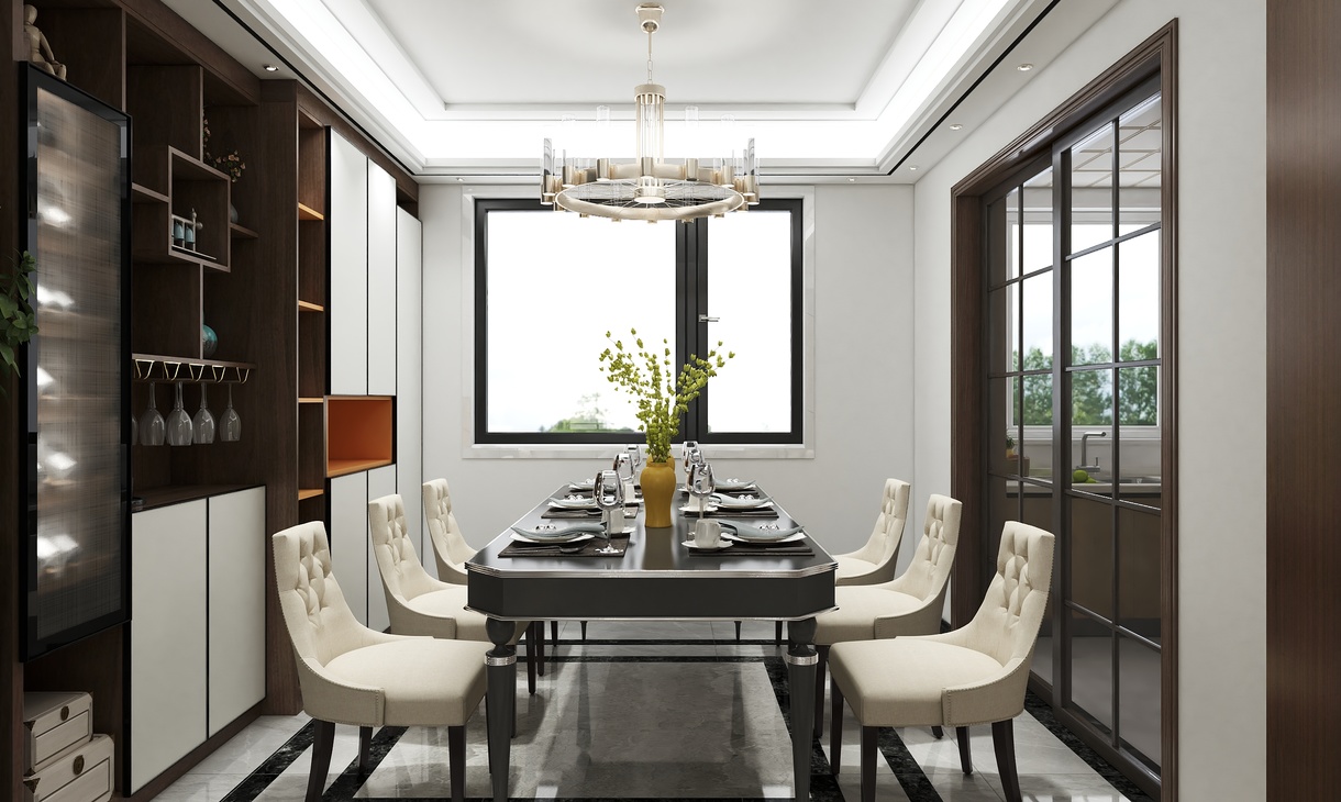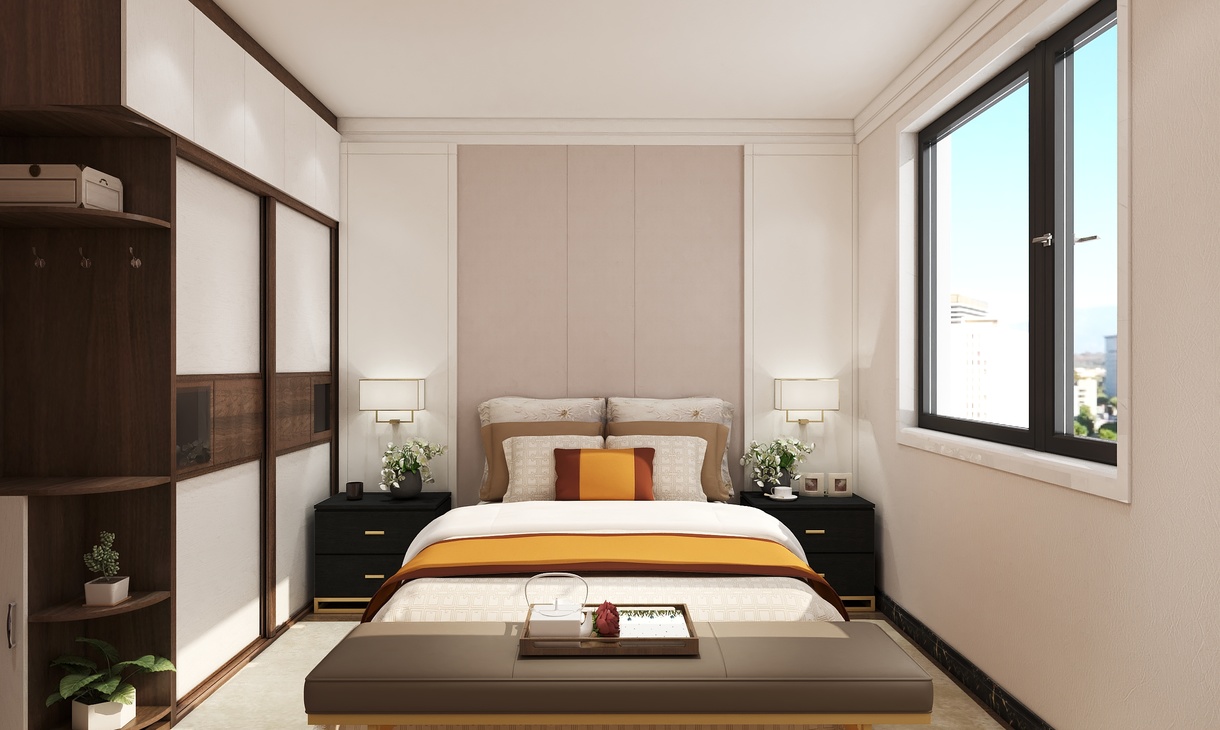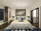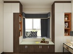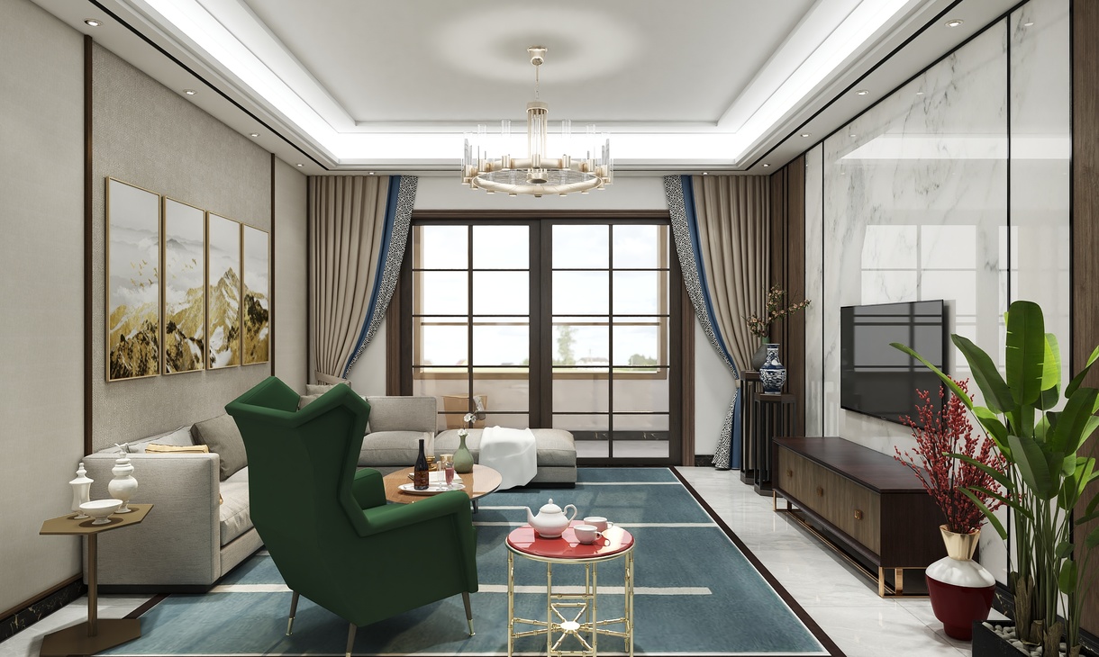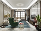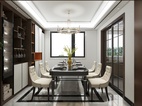 新中式風(fēng)格,整個(gè)空間主要以家具為主題;為了整個(gè)空間與家具在視覺上達(dá)到協(xié)調(diào)、舒適、溫馨的效果,設(shè)計(jì)師在天花邊緣以及背景墻上利用接近家具色系的香檳金裝飾線條。電視和沙發(fā)背景墻大量使用木飾面板貫穿整個(gè)空間,使整個(gè)空間有著溫馨舒適的環(huán)境。