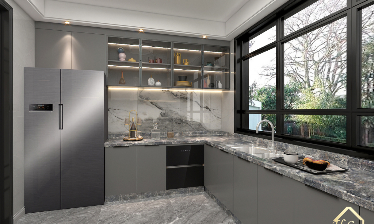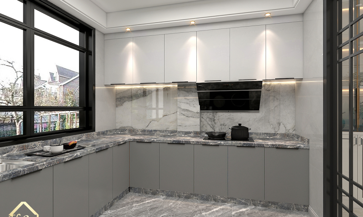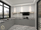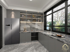 廚房采用柜門灰白搭配,深灰色的大理石系搭配的U型廚房,寬敞的臺面為烹飪提供足夠的使用空間
