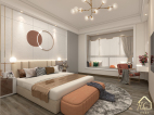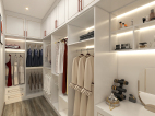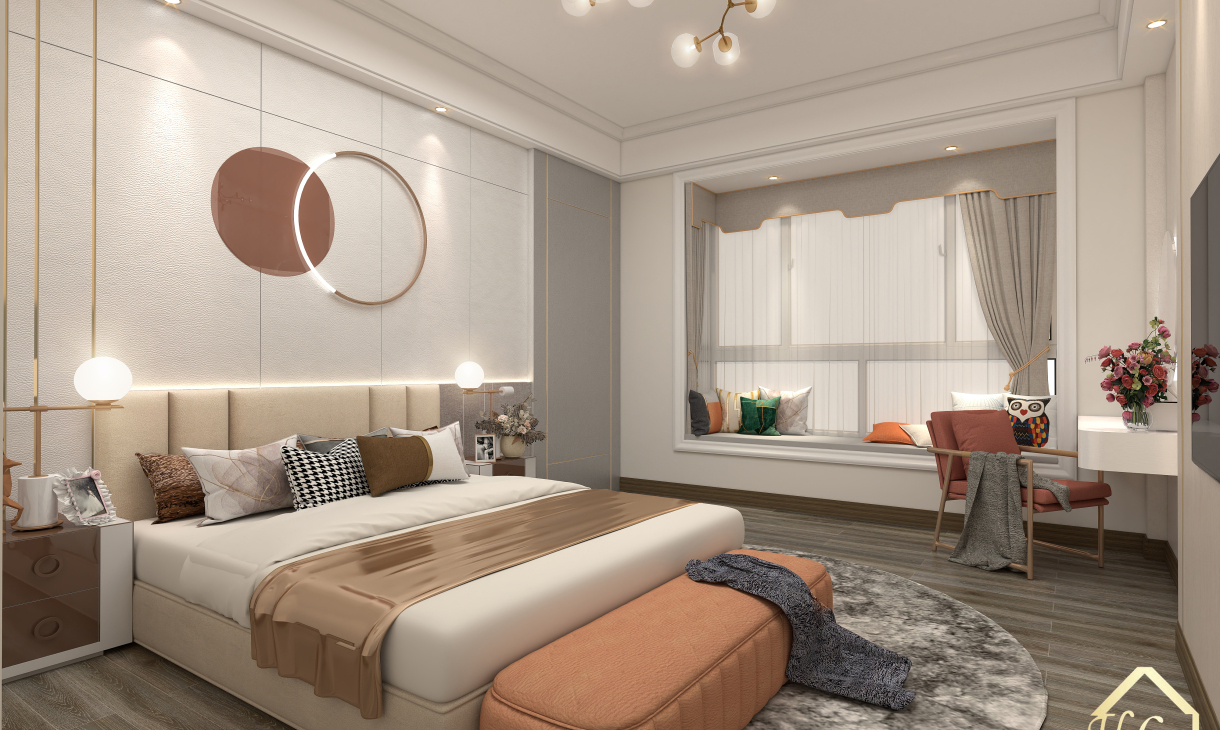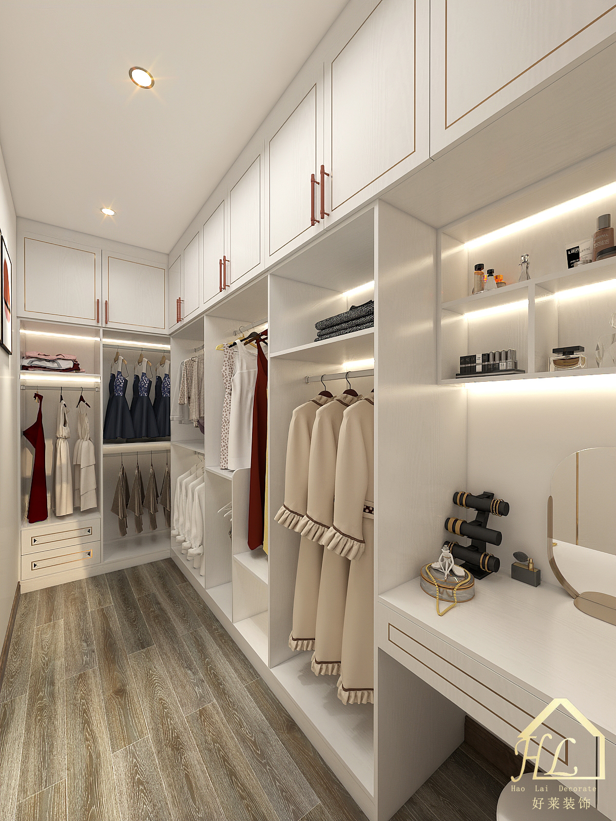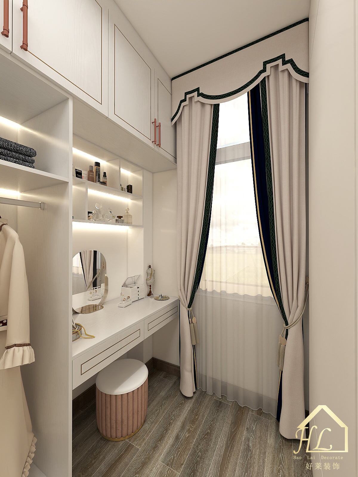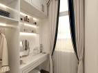 衣柜主體淺色搭配門板描金邊線,凸顯了時(shí)尚線條美,靠窗邊設(shè)計(jì)了極簡梳妝臺,體現(xiàn)空間的最大使用化