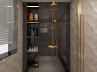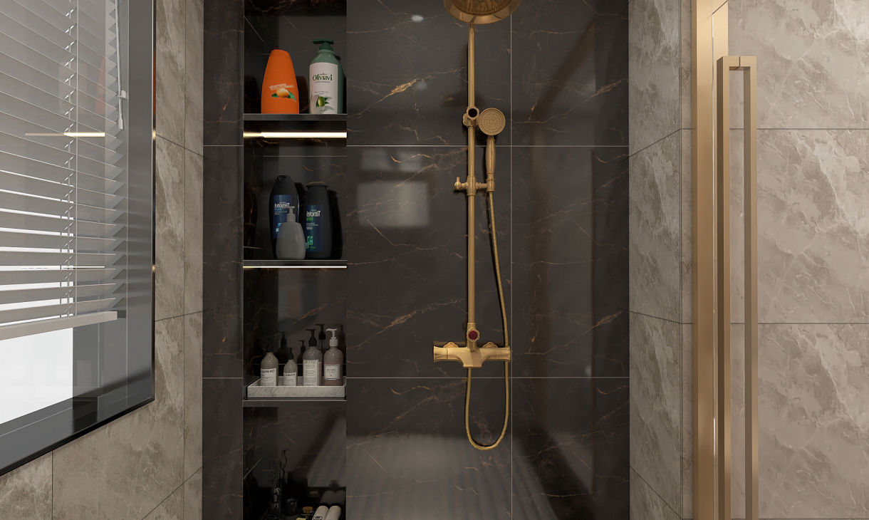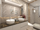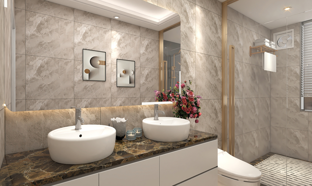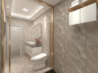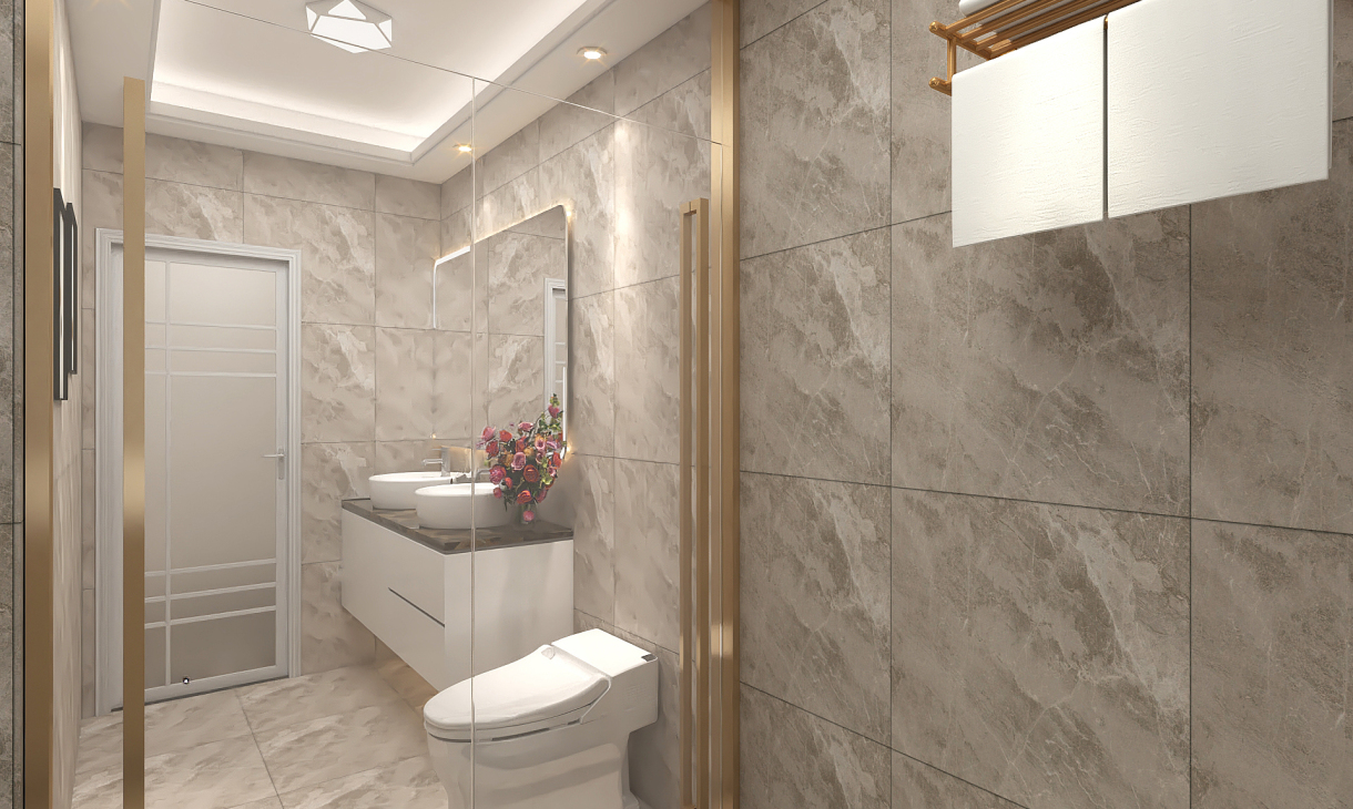 衛(wèi)生間淺色石材縈繞空間四維,與深啡色石臺,淋浴區(qū)的儲物區(qū)鮮明對比,大氣而不失時(shí)尚,干濕分離設(shè)計(jì),干區(qū)用了金屬鑲邊清玻璃與公共區(qū)隔離。簡約的臺盆柜造型精致,耐看又實(shí)用,完美演繹生活的篇章。