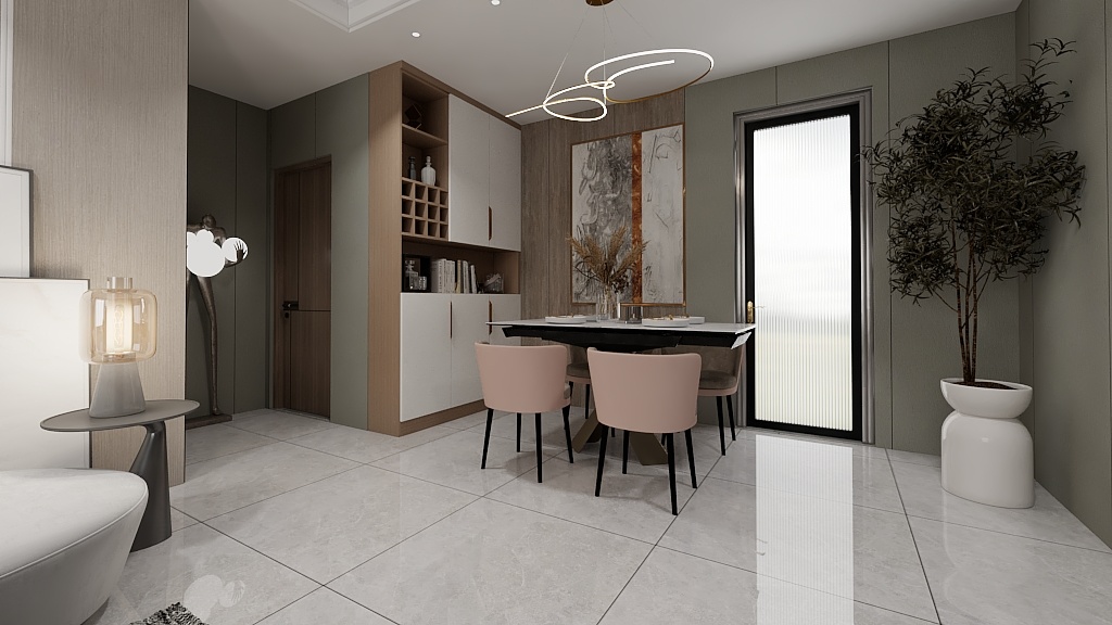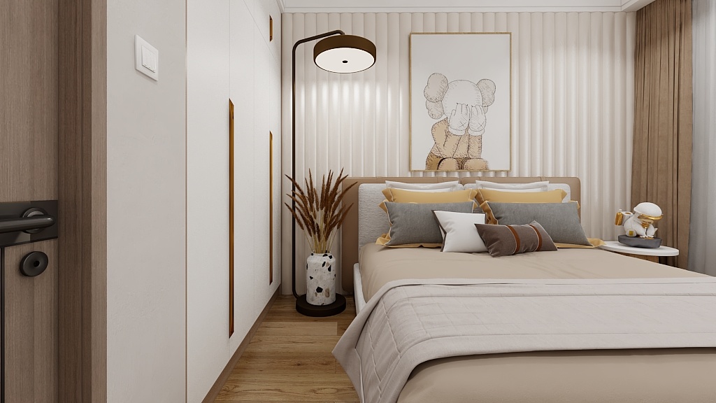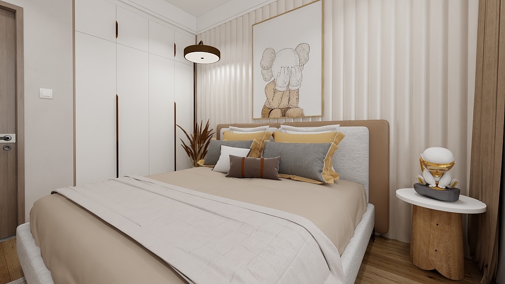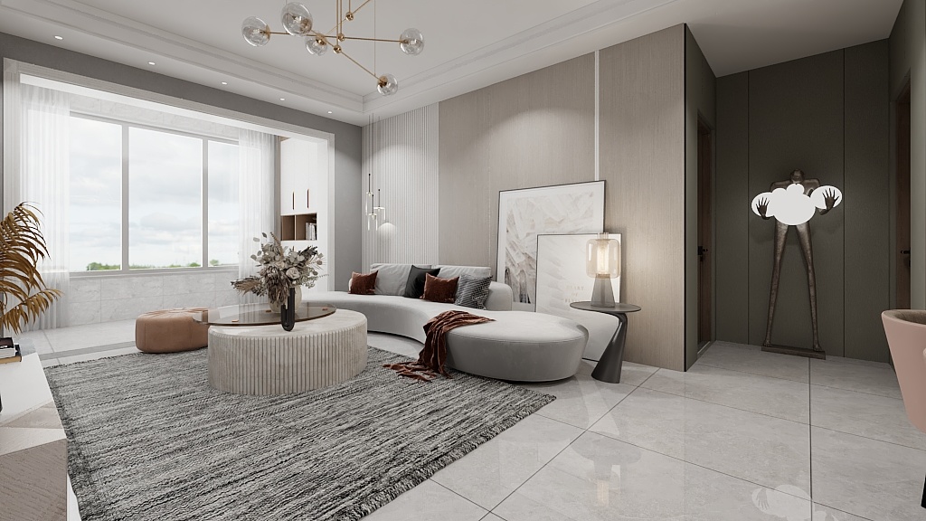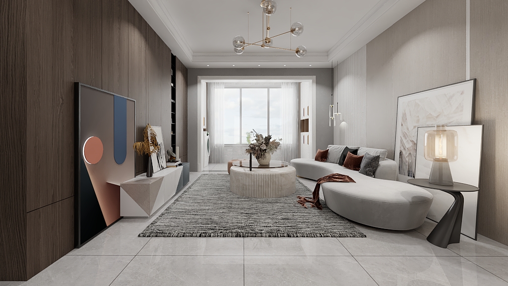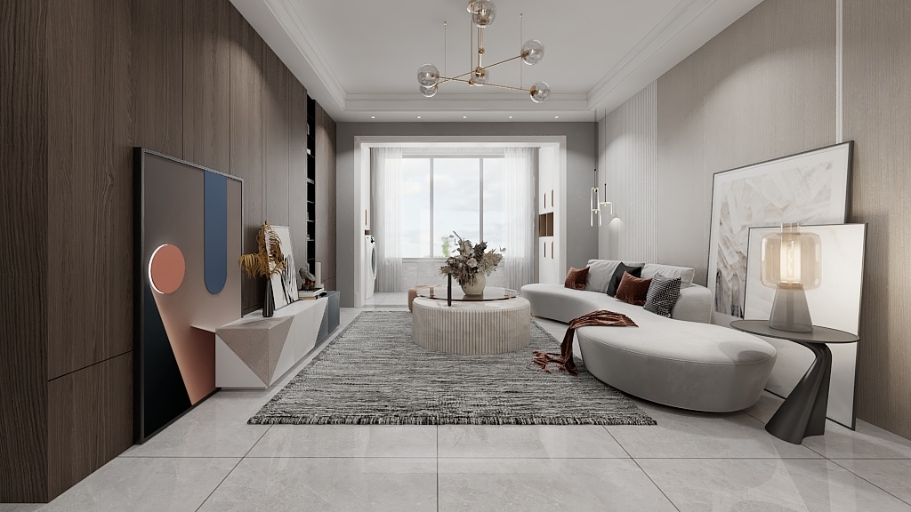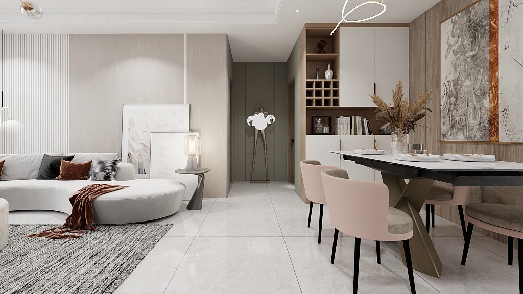 扭曲變形的“S”形絨布軟包裝飾墻,搭配沉靜而不失活力的牛皮棕,交互點(diǎn)染空間的同時(shí),賦予空間獨(dú)特的藝術(shù)美感。落地?zé)?,?shí)木小邊幾,無一不是獨(dú)到的美學(xué)見解。