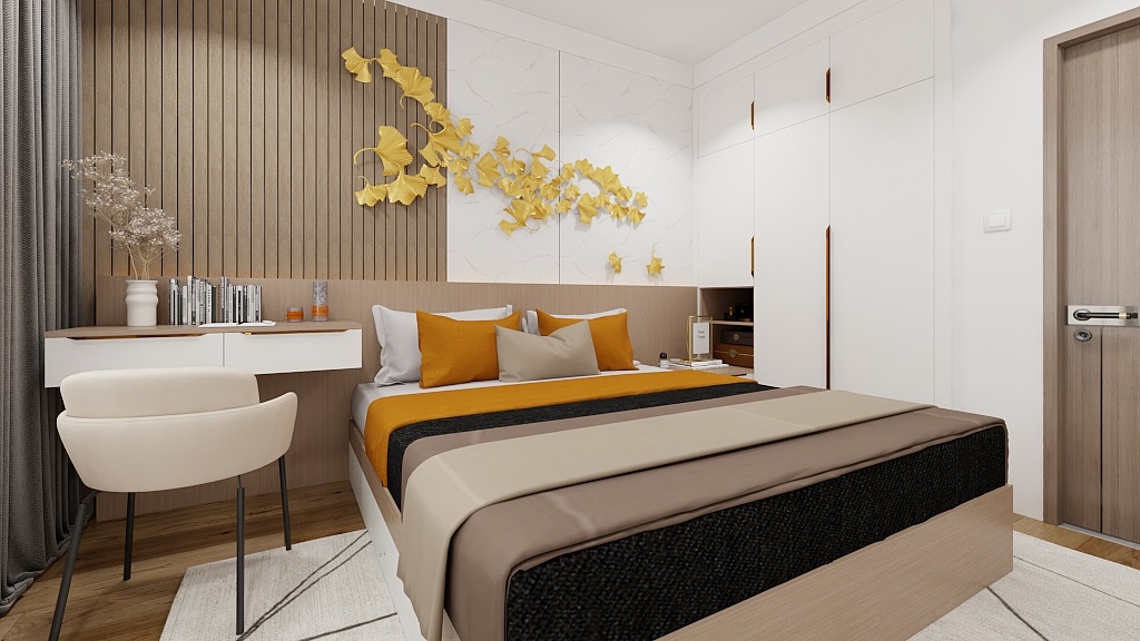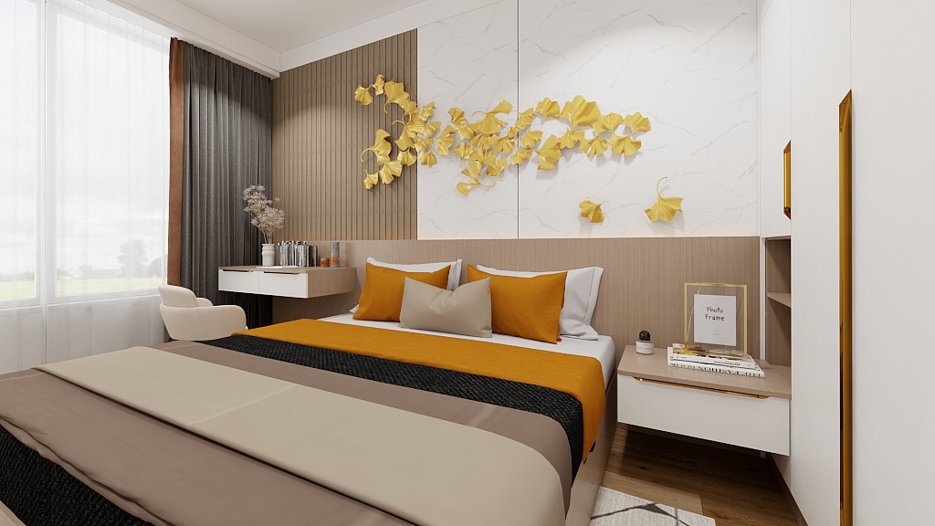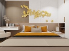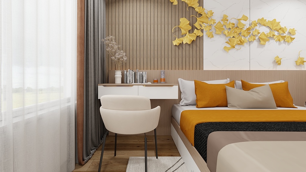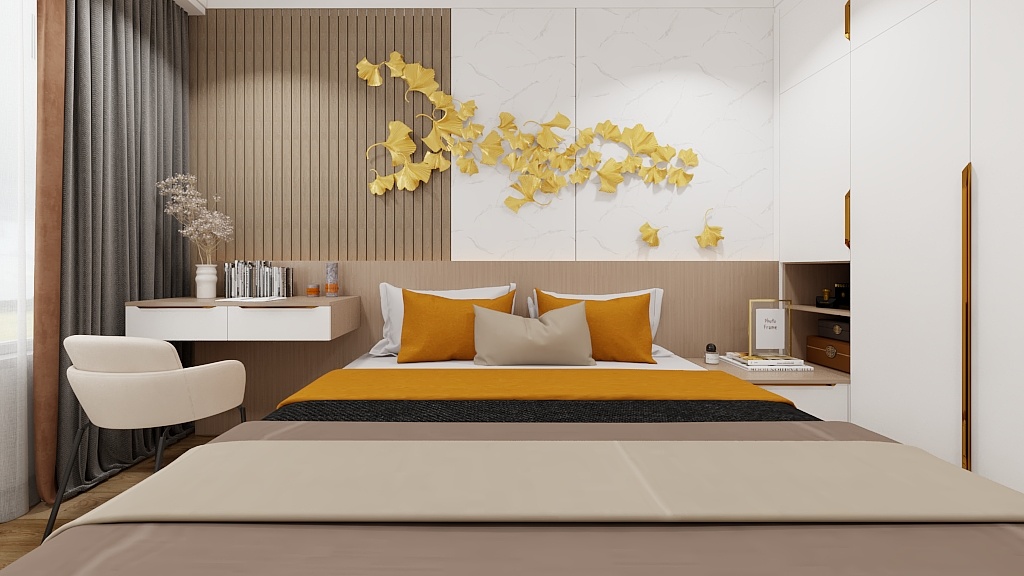 光線越過窗,與室內(nèi)的木紋形成有機(jī)串聯(lián),自然便觸手可及。迎面相對(duì)的烤漆墻板與藝術(shù)銀杏葉裝飾,搭配層疊的天花,交織的線條讓空間充滿律動(dòng)感,營造身臨其境的空間立體感。一入身心歸位,平靜舒展