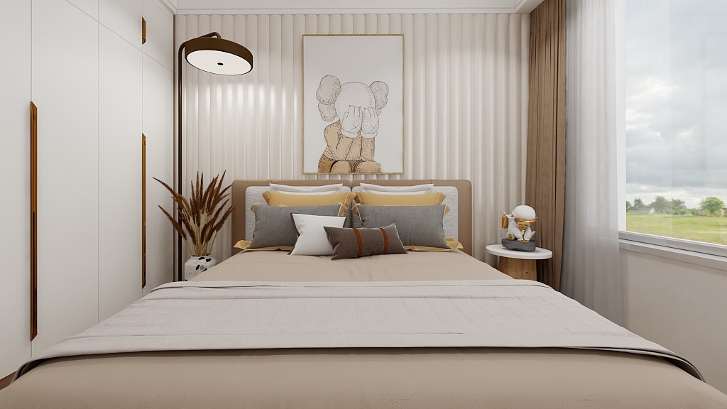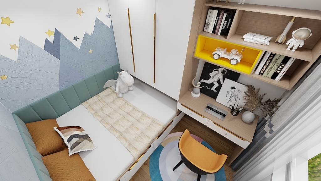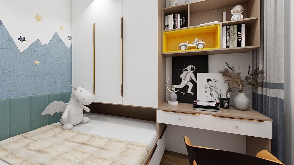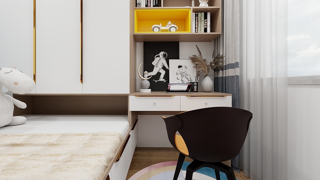 兒童房的主題是陽光、健康、快樂的檸檬黃是空間的主色調(diào)。玩偶、手辦、絨球、織物,復(fù)雜的觸感點(diǎn)綴簡單的空間,書桌臨窗而設(shè),以簡單的陳設(shè)平衡簡繁,提升兒童房的空間美感。