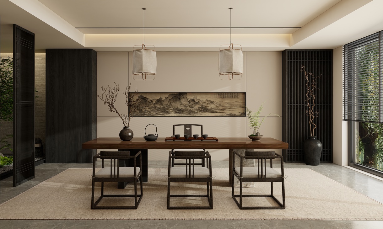 在宋代美學(xué)融合下,體現(xiàn)了簡(jiǎn)約、自然與優(yōu)雅的設(shè)計(jì)理念。整體設(shè)計(jì)融合了傳統(tǒng)與現(xiàn)代元素,營(yíng)造出一種寧靜而富有文化氣息的環(huán)境。山水畫的運(yùn)用不僅美觀,也傳達(dá)了對(duì)傳統(tǒng)文化的尊重與繼承,體現(xiàn)了宋代文人對(duì)藝術(shù)的追求。